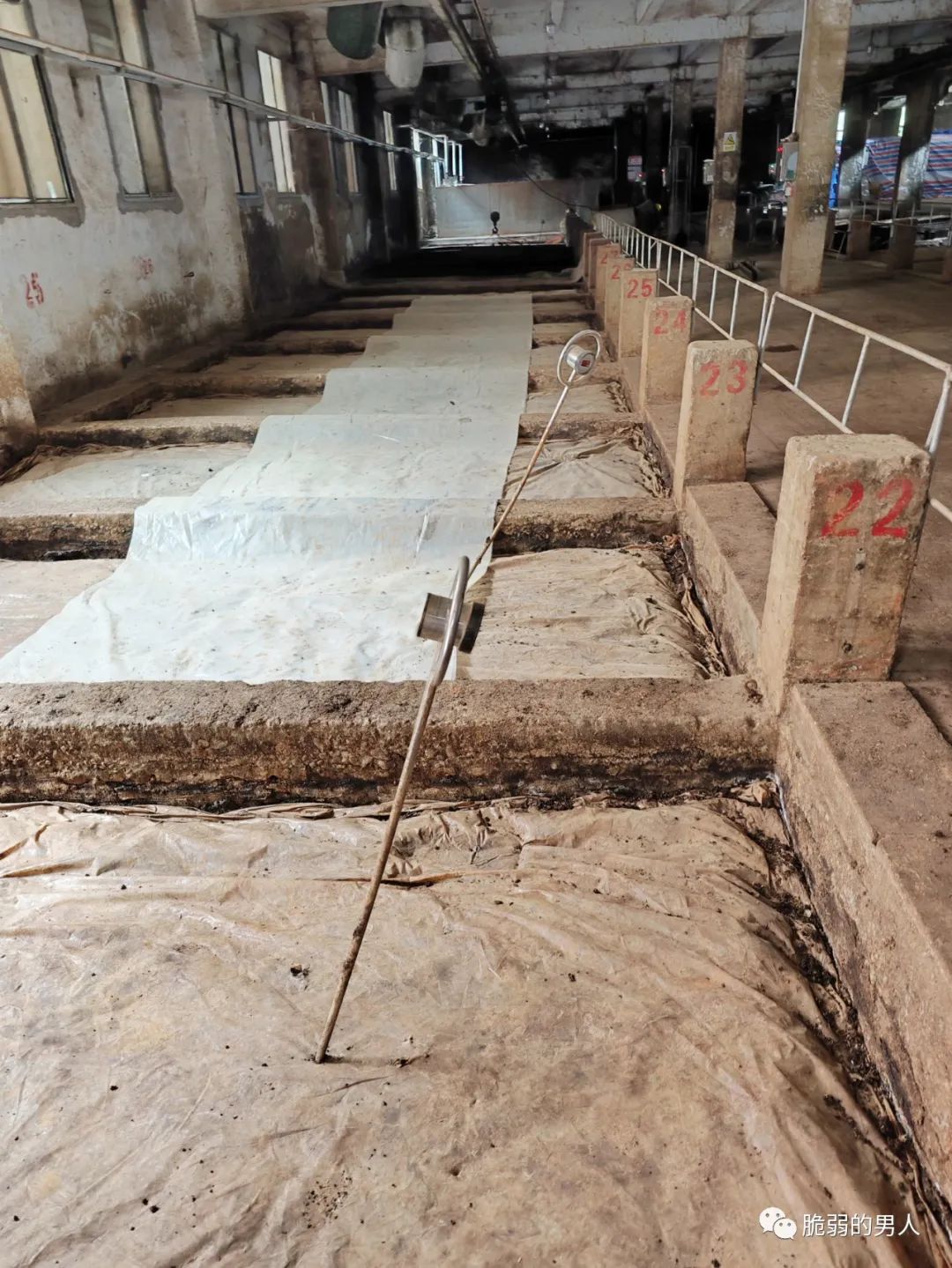 如果把粮食放入窖池内发酵,我们看到的,就会是下面的样子。上面还插了巨大的温度计,实时监控和发送窖池的温度。