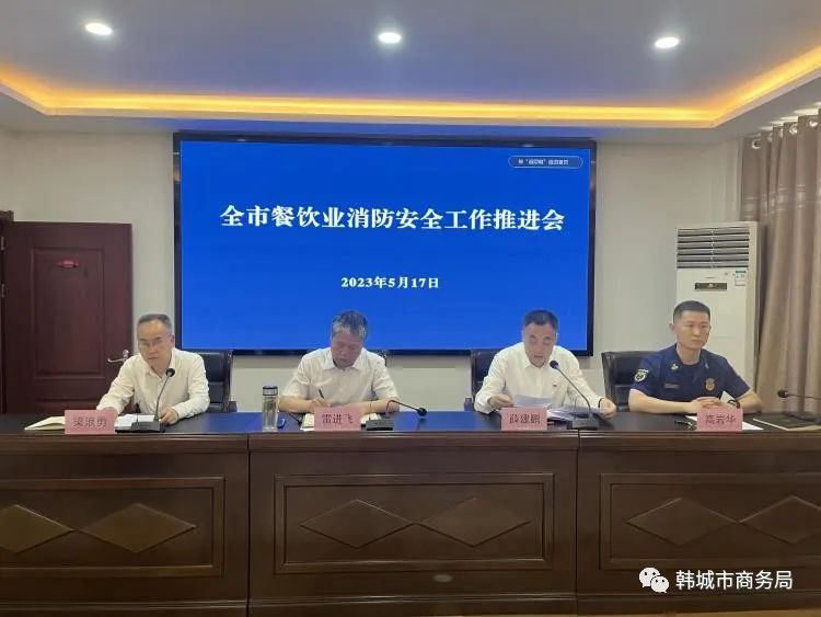 5月17日,全市餐饮业消防安全工作推进会在市消防救援大队会议室召开,市委常委、副市长、市商贸和成品油领域安全生产委员会主任雷进飞出席,市商务局、市消防救援大队、市场监管局、教育局、住建局、公安局、应急管理局等单位,全市500平米以上的餐饮经营企业代表、全市中小校企代表参加。市商务局党组书记、局长薛建鹏主持。