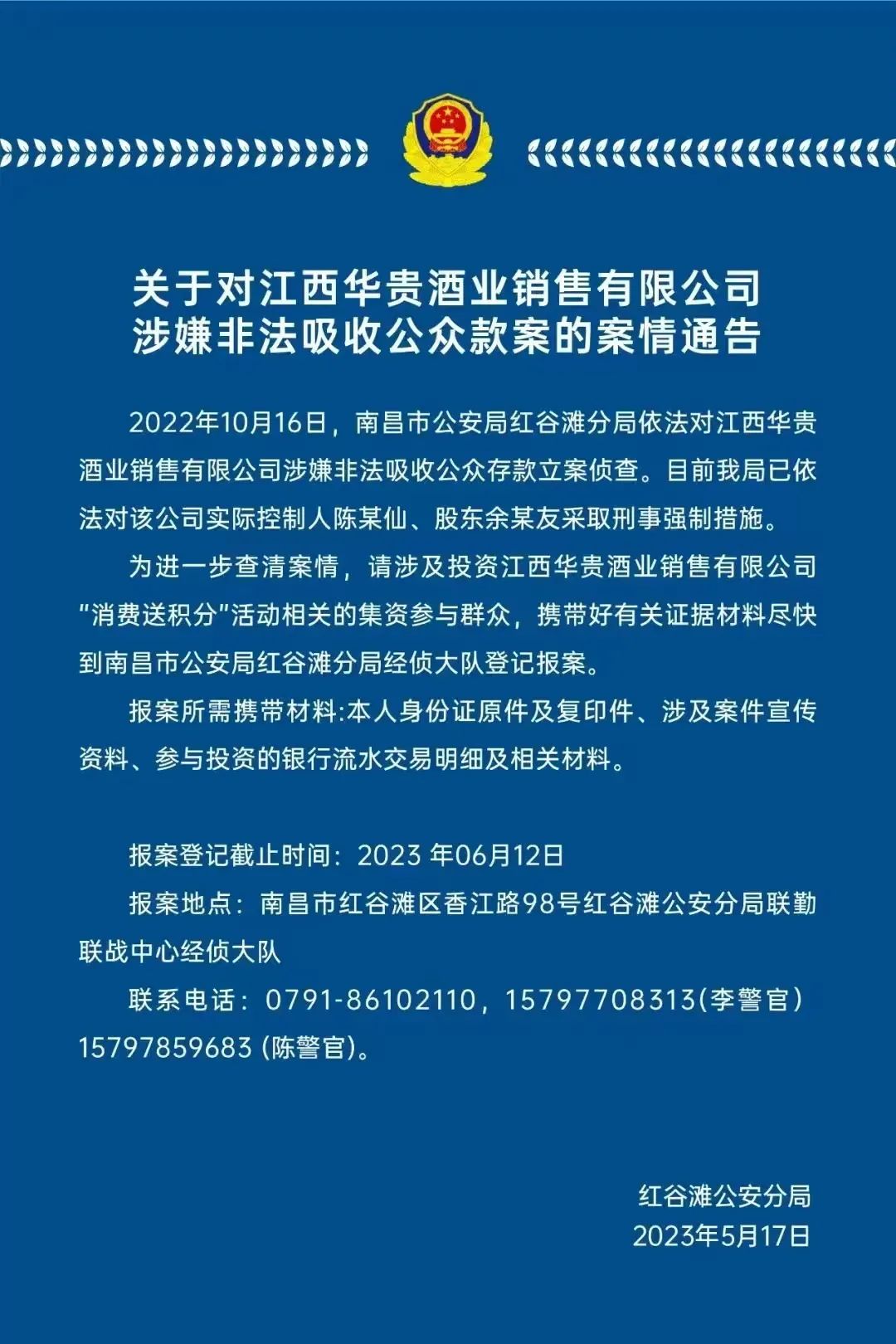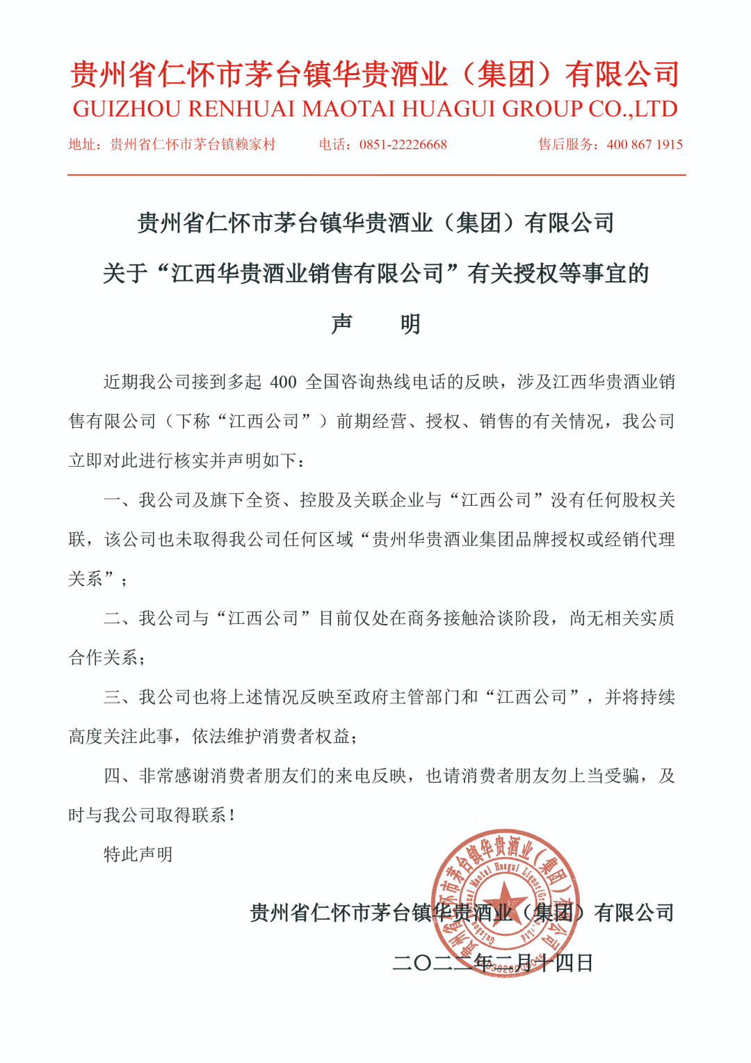 近期我司接到多起400全国咨询热线电话的反映,涉及江西华贵集团酒业销售有限公司相关情况,我司立即对此事进行核实并声明如下: