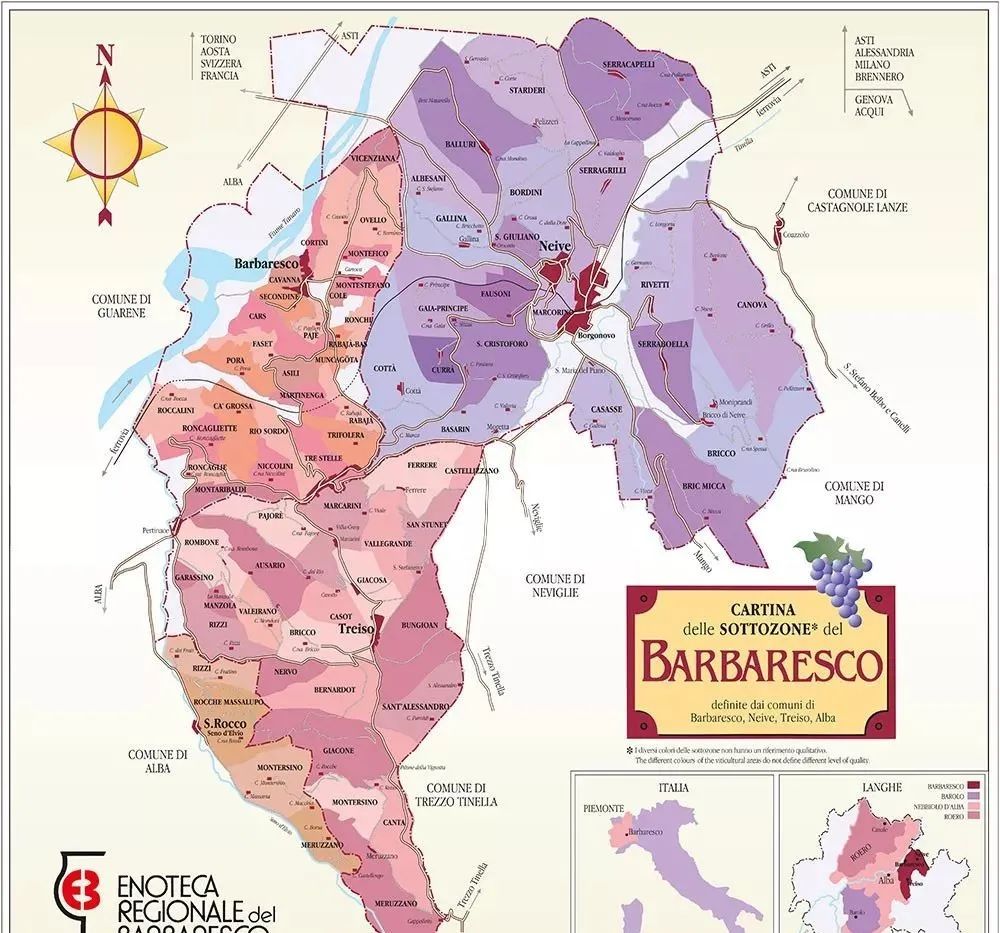 巴巴莱斯科产区主要由 3 个村庄组成,分别是内华村(Neive)、巴巴莱斯科村和特黑索村(Treiso)。这 3 个村庄占近 95% 的产量。其中,内华村以酒体饱满、单宁强劲和结构丰富而闻名,巴巴莱斯科村葡萄酒以结构紧致、花香浓郁、颜色和酒体较轻著称,特黑索村葡萄酒酒体最轻。