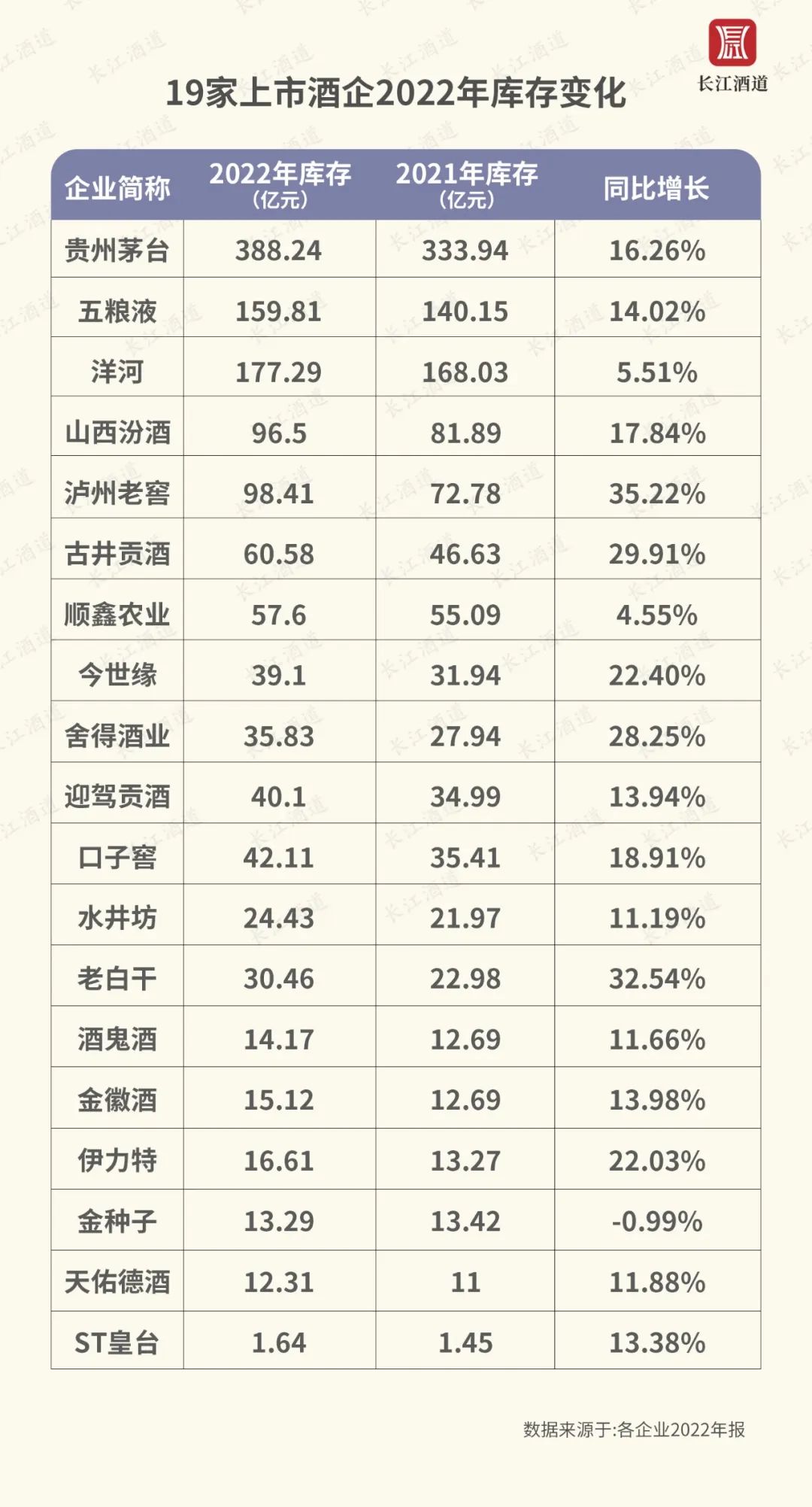 2022,泸州老窖、老白干酒、古井贡酒、舍得酒业、今世缘、伊力特6家企业存货增长20%以上。