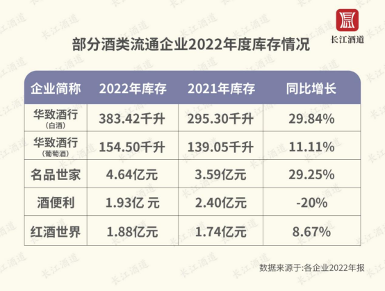 2022,,流通类企业有增加近30%,少的也接近10%。华致酒行截至2022年底,其存货规模高达34.29亿元,占其总资产的40%以上。