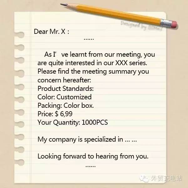 这样一个很正式的会谈纪要,会让客户觉得你很专业,里面还可以附上你当时跟客户拍的照片,合影或者他感兴趣的产品图片,这样会更引人注意。