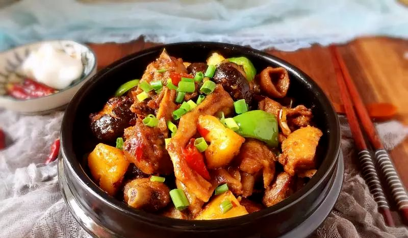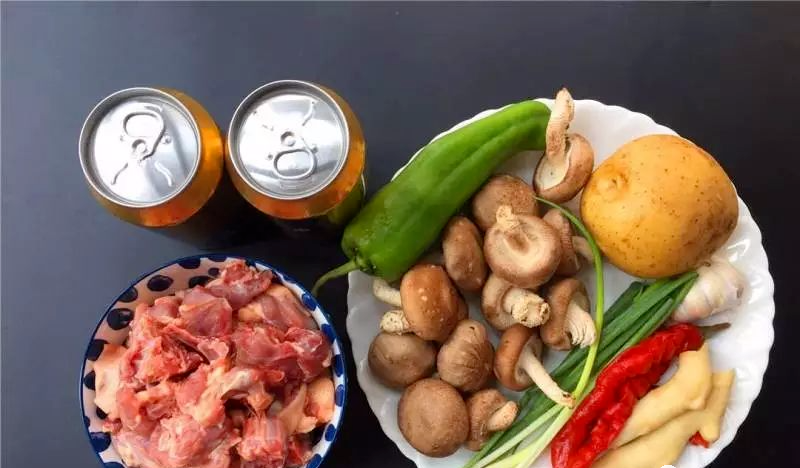 鸭肉500克啤酒2罐香菇100克土豆1个大青椒1个泡椒2根泡姜2块大蒜5瓣花椒适量八角3颗小葱2根生抽适量豆瓣酱2勺老干妈油辣椒2勺