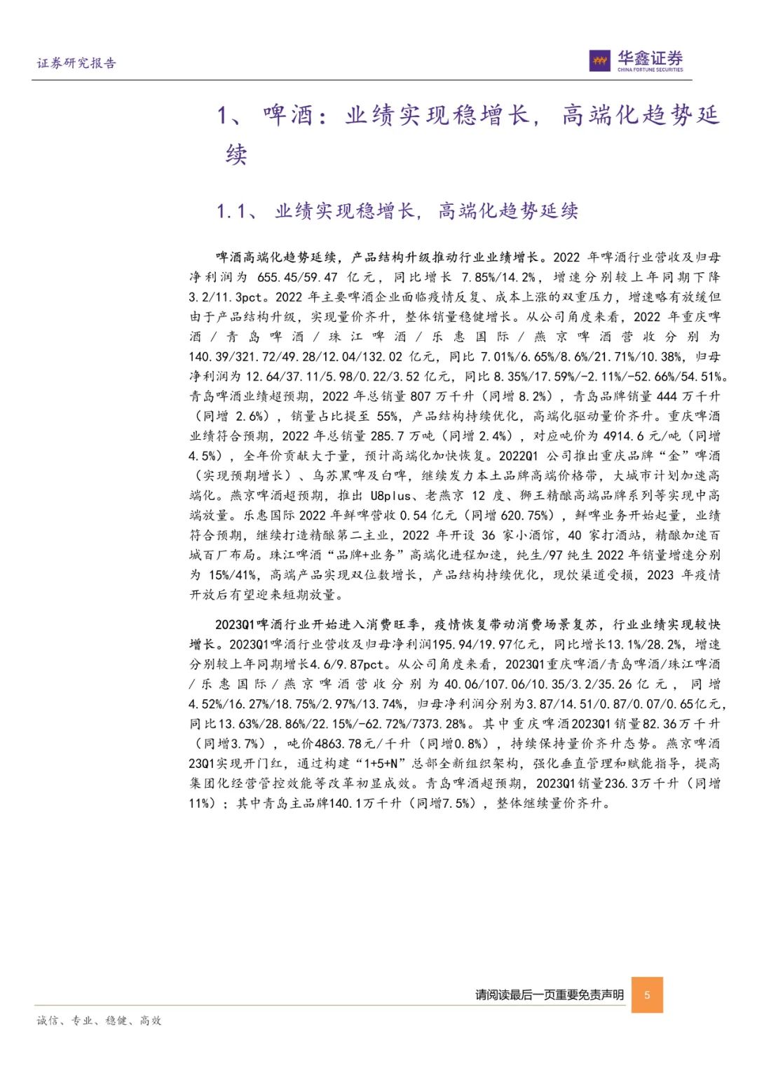 啤酒:业绩实现稳增长, 高端化趋势延续啤酒高端化趋势延续,产品结构升级推动行业业绩增长。