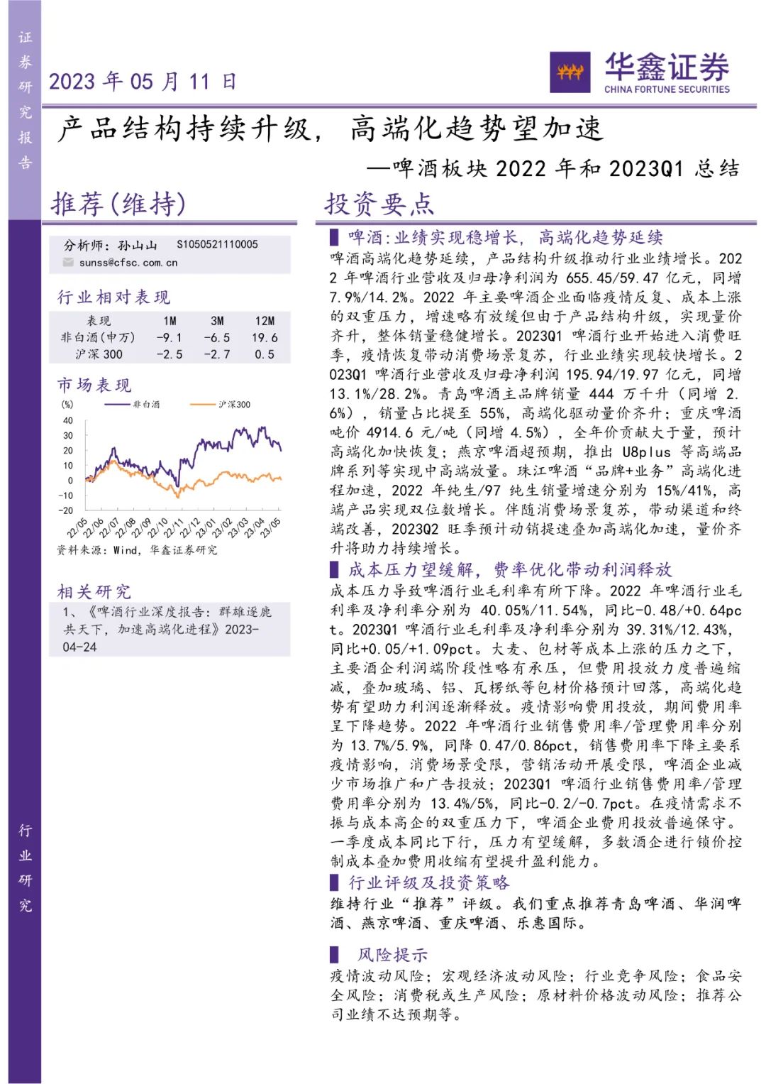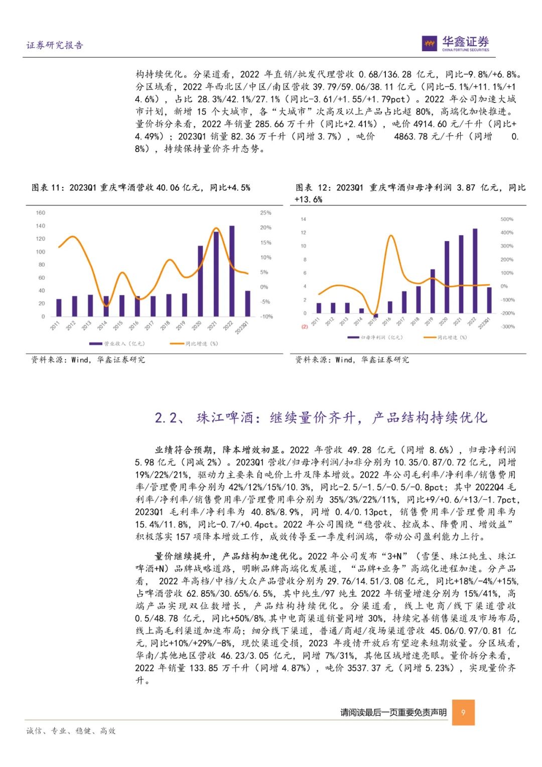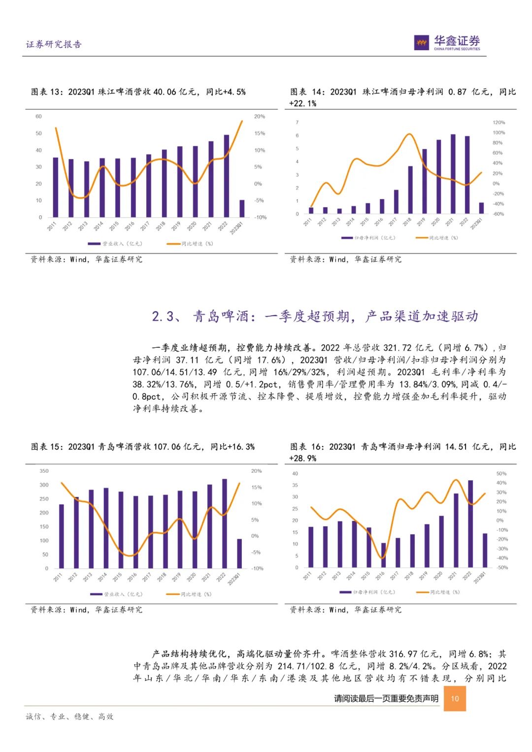 2023Q1啤酒行业营收及归母净利润195.94/19.97亿元,同增13.1%/28.2%。青岛啤酒主品牌销量444万千升(同增2.6%),销量占比提至55%,高端化驱动量价齐升;重庆啤酒吨价4914.6元/吨(同增4.5%),全年价贡献大于量,预计高端化加快恢复;燕京啤酒超预期,推出U8plus等高端品牌系列等实现中高端放量。
