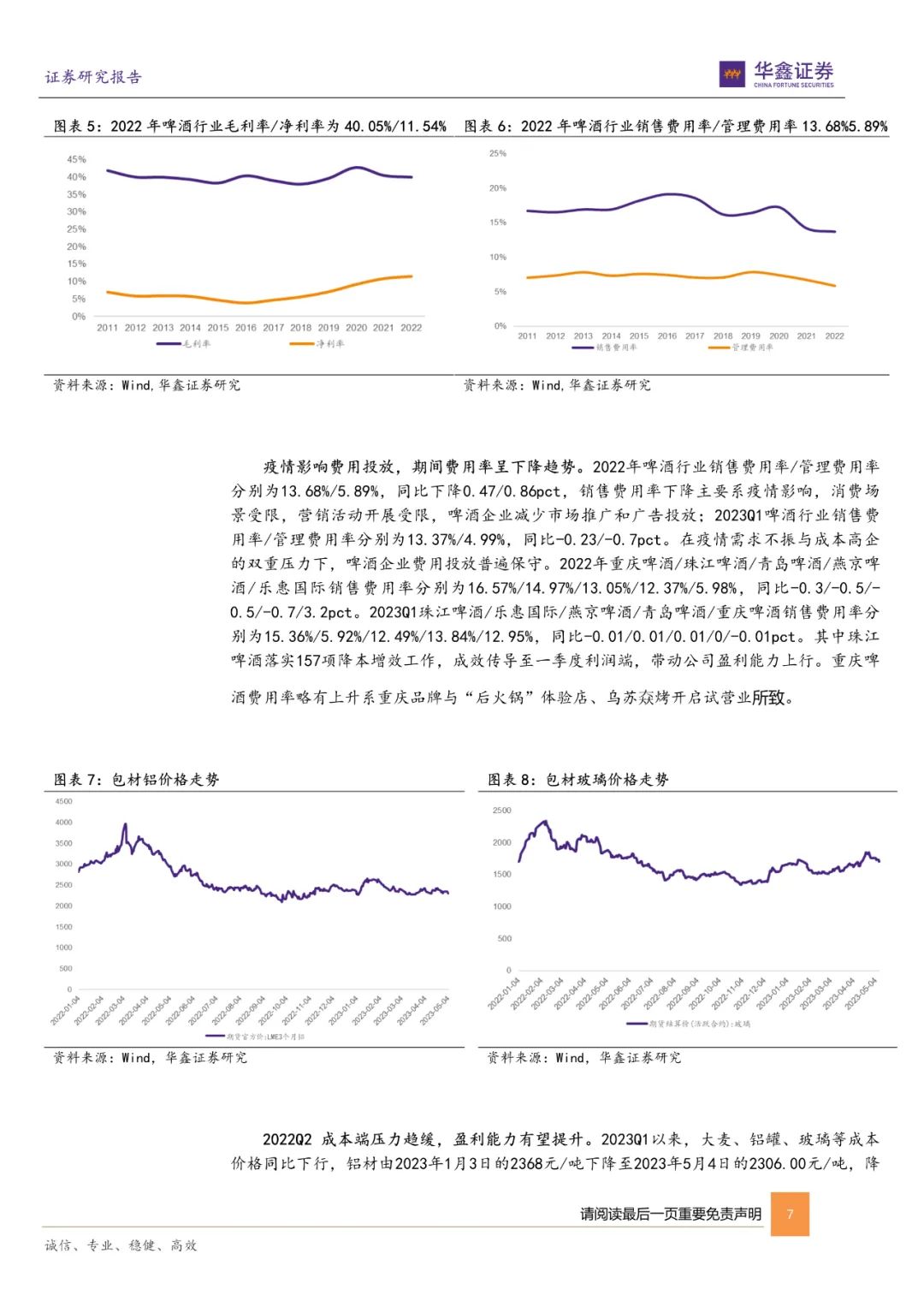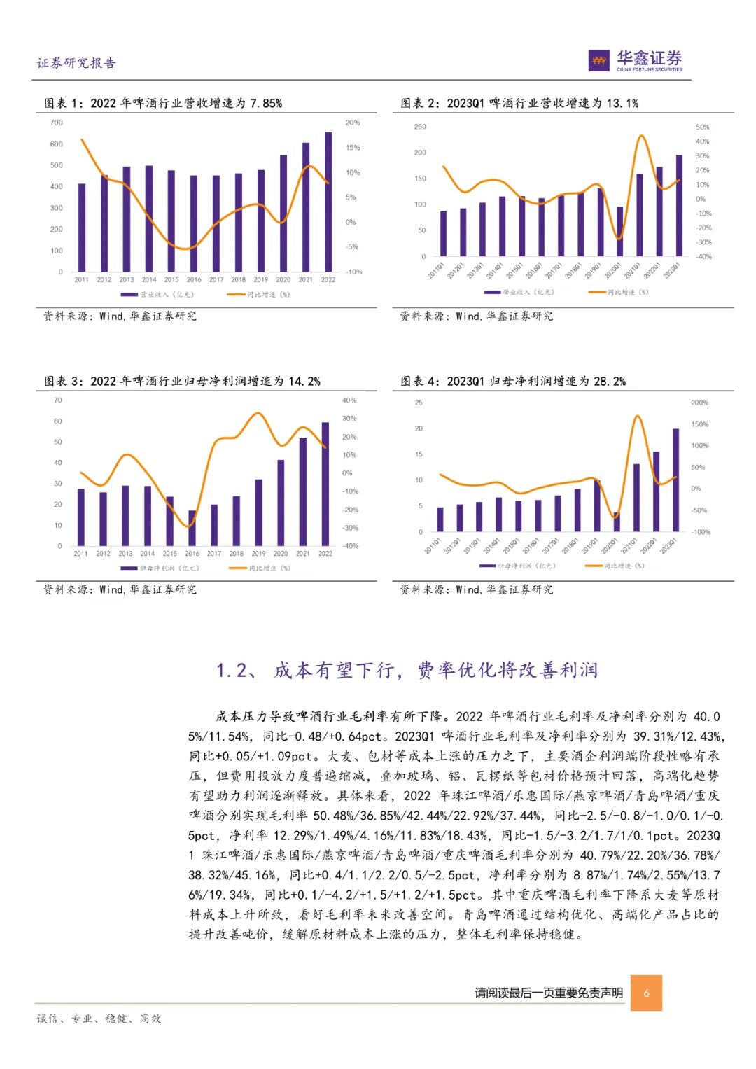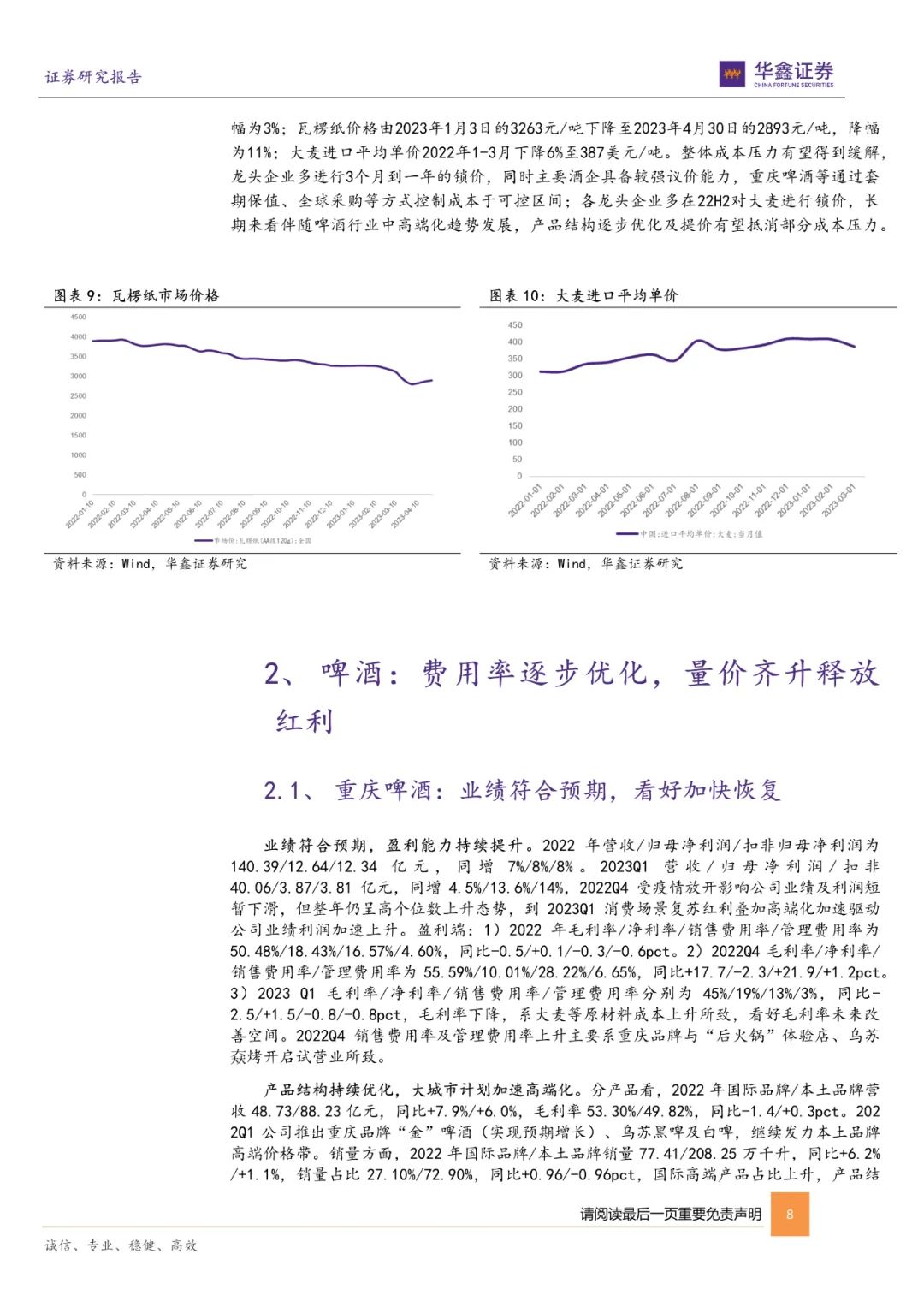 2023Q1啤酒行业营收及归母净利润195.94/19.97亿元,同增13.1%/28.2%。青岛啤酒主品牌销量444万千升(同增2.6%),销量占比提至55%,高端化驱动量价齐升;重庆啤酒吨价4914.6元/吨(同增4.5%),全年价贡献大于量,预计高端化加快恢复;燕京啤酒超预期,推出U8plus等高端品牌系列等实现中高端放量。