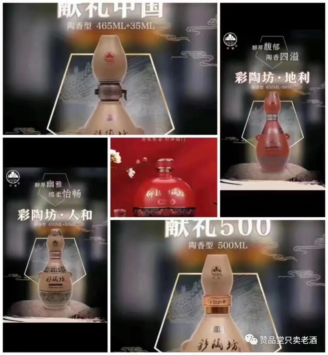 彩陶坊每年30亿的销售额,作为豫酒的老大,振兴豫酒,振兴河南。以独特的陶瓶设计,多粮酿造口感,独特的1两+9两包装方式,放你品味之时可独酌70°浓烈劲爽;也可畅饮45°绵柔香,彩陶坊的崛起也带动了河南的宴席市场。彩陶坊宴席指导价:地利980元/箱,人和530元/箱,献礼中国420元/箱,献礼500,370元/箱