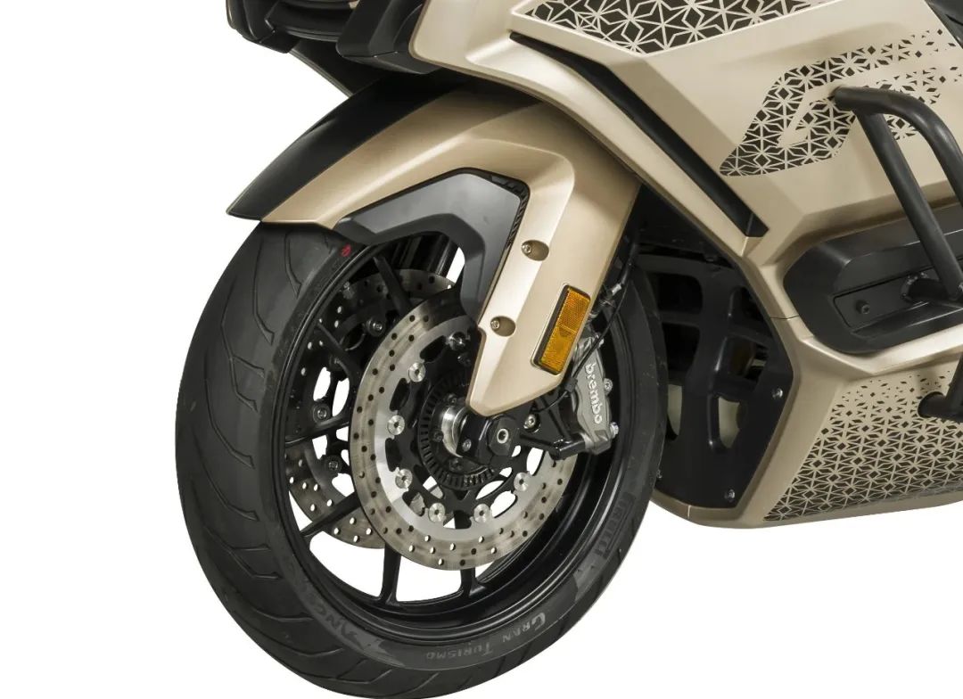5、高规格安全配置:前后刹车均采用了意大利原装进口Brembo制动卡钳,制动性能优越,前四活塞后双活塞卡钳,可靠性、安全性高。标配博世双通道ABS防抱死系统。为进一步提升车辆操控性,还采用了悬挂轴后平叉轴的共轴设计,使发动机与车架的整体强度更高,更安全,操控性更出色。