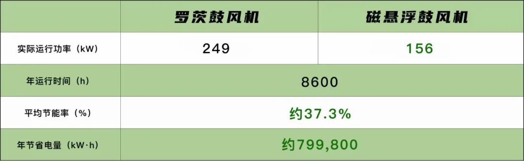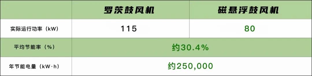 设备改造后:2台磁悬浮鼓风机运行实际功率约为80kW,整体设备节能率约30.4%,年节电量约250000kW·h!