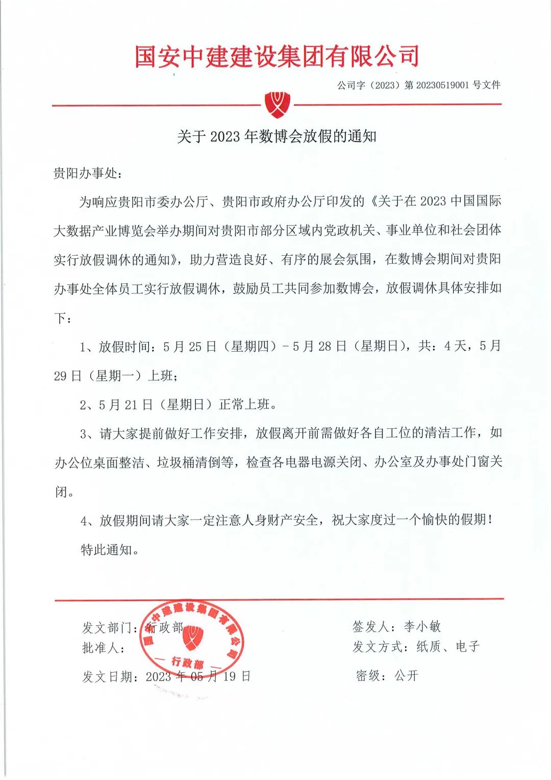 为响应贵阳市委办公厅、贵阳市政府办公厅印发的《关于在2023中国国际大数据产业博览会举办期间对贵阳市部分区域内党政机关、事业单位和社会团体实行放假调休的通知》,助力营造良好、有序的展会氛围,在数博会期间集团对贵阳办事处全体员工实行放假调休。