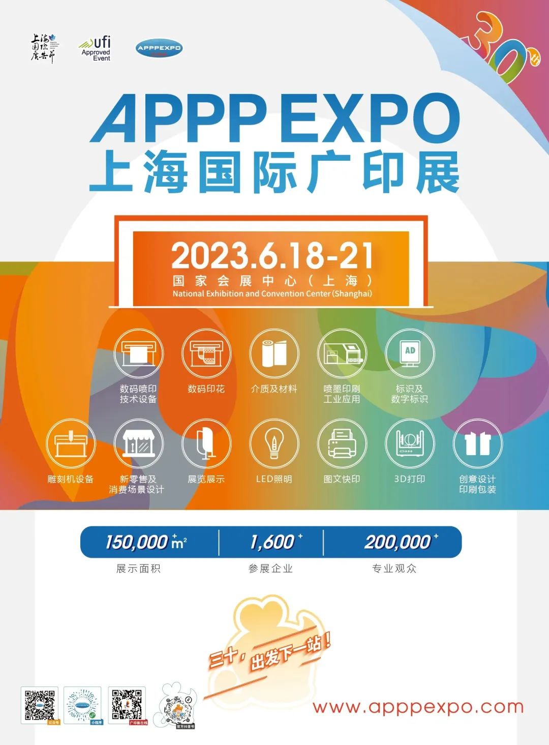 2023 APPPEXPO上海国际广印展将于6月18-21日在国家会展中心(上海)精彩亮相,展会展览面积达15万平米,现场预计将有1600+展商及超过200,000名海内外专业买家共襄盛举,汇集喷印、切割、雕刻、材料、标识、展示、商业零售、照明、印花、快印、包装、喷墨印刷工业应用等领域的创新产品和技术成果,集纳海量行业龙头展商,为广大专业买家提供多元观展体验及海量采购选择。