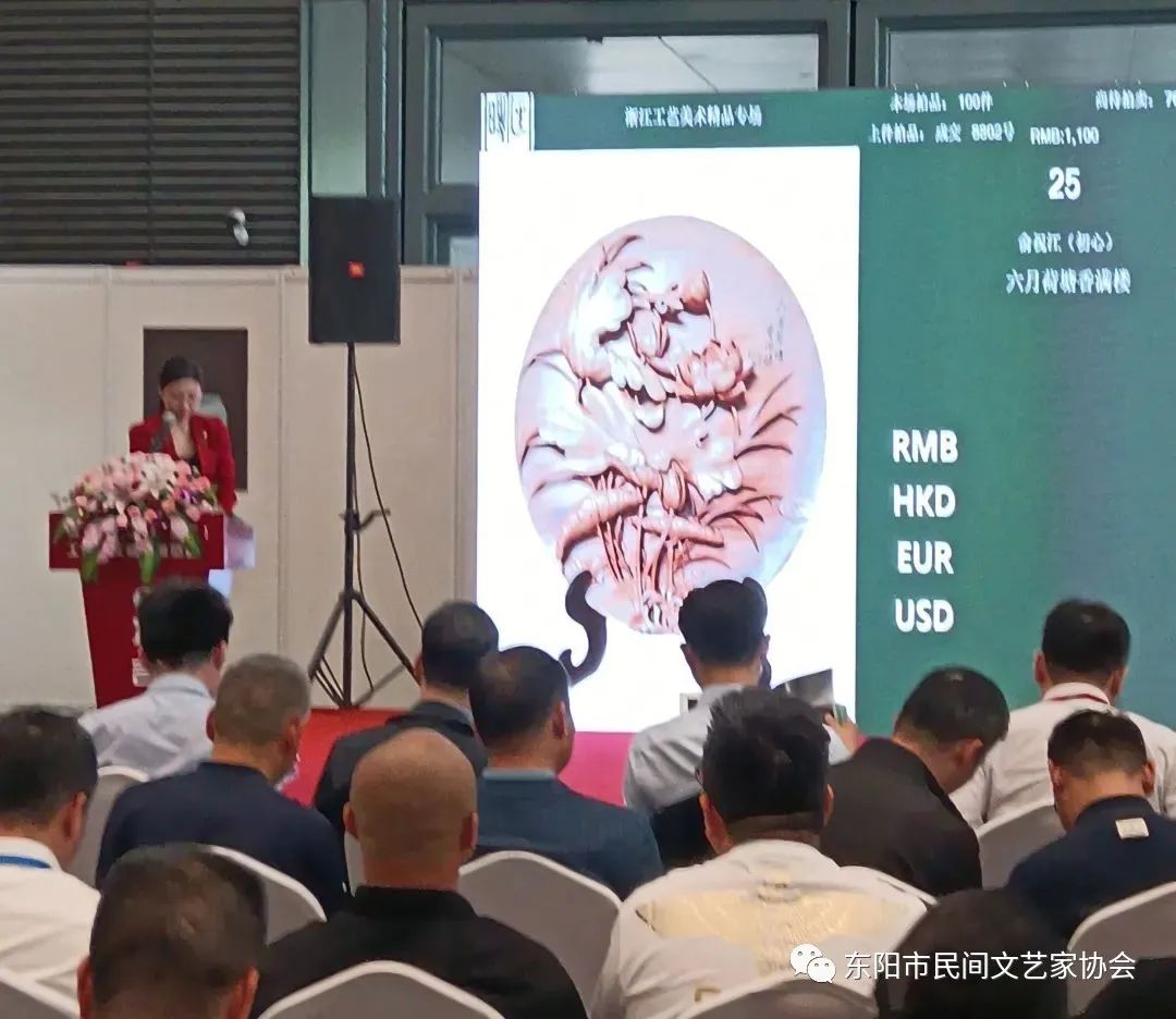 本届博览会还举办了“浙江省工艺美术精品慈善拍卖”活动。拍卖分线上线下,近百件拍品全部成交。待成交额核对无误后,博览会将和浙江妇女儿童基金会对接捐款事宜,并向全行业公示。我会王向东主席的木雕作品47*32.5*3.5《月德呈瑞》参与了拍卖,落槌价RMB1800元。其他参与拍卖的会员有俞祝江的《初心》、王飞龙的《五福临门》等。