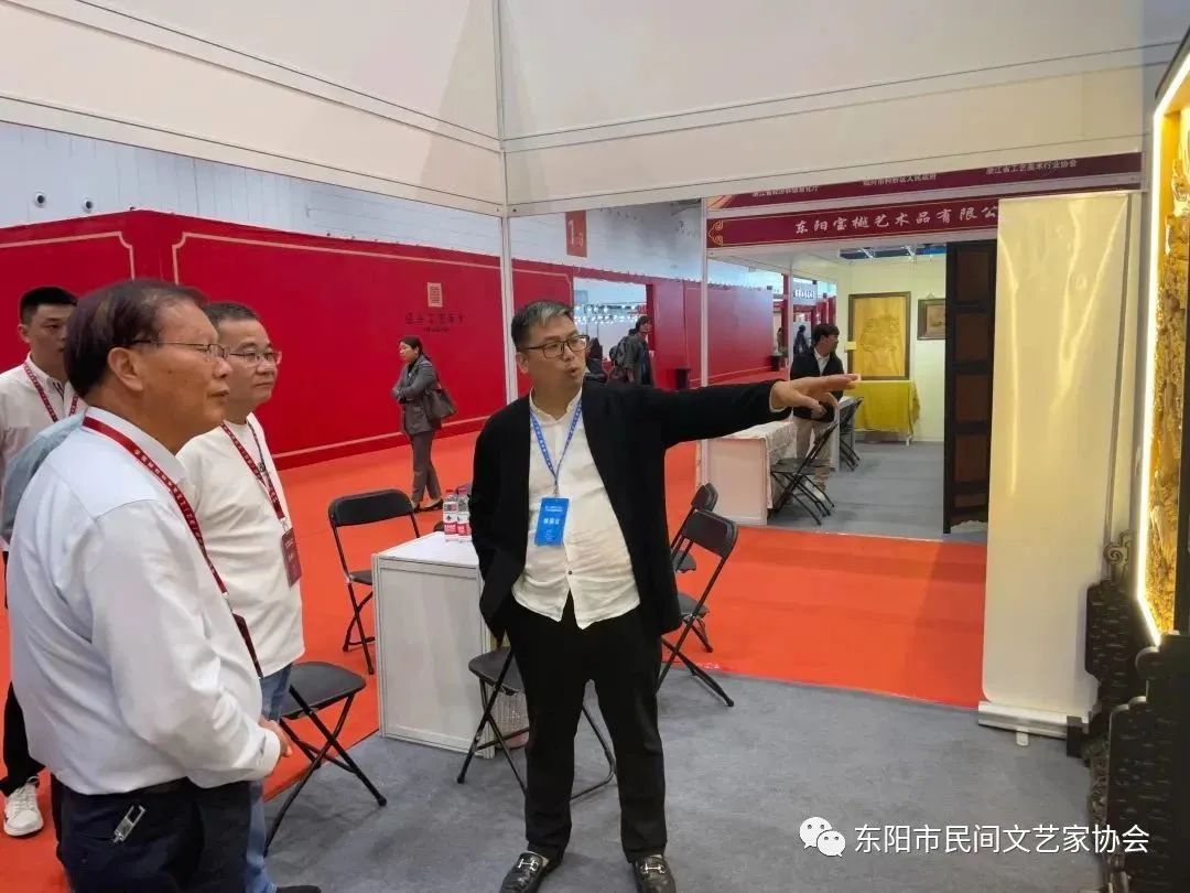 12日下午,博览会开幕式现场举行了第七届浙江省工艺美术大师颁证大会,由重要嘉宾为129位新晋省大师颁发证书,东阳有12人获此殊荣,东阳民协占7个:王飞龙,郭向峰,郭向华,孙权,厉鹏强,俞祝江,李斌。