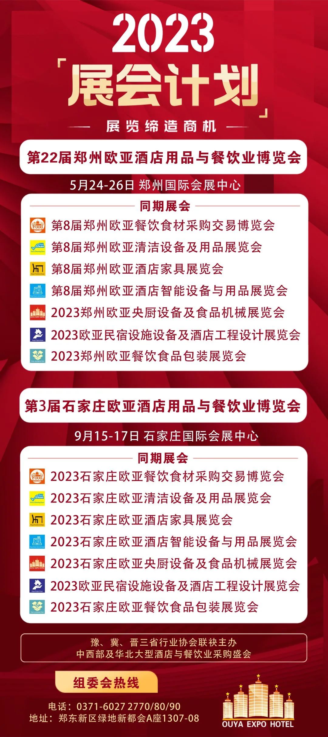 由河南省餐饮与住宿行业协会主办、河南省餐饮与住宿行业协会供应商委员会会展部承办的2023第22届郑州欧亚酒店用品与餐饮业博览会将在5月24-26日盛大启幕,酒店用品与餐饮行业新老朋友即将迎来再度重逢!