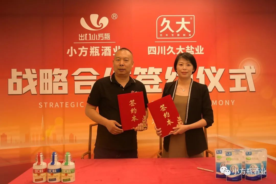 2023年5月18日,小方瓶酒业与四川久大盐业战略合作签署仪式在北京举行。小方瓶酒业董事长张晨光、执行董事张冠涛;四川久大制盐有限责任公司销售总公司总经理何巧、四川久大制盐有限责任公司销售总公司谢家祥参加。