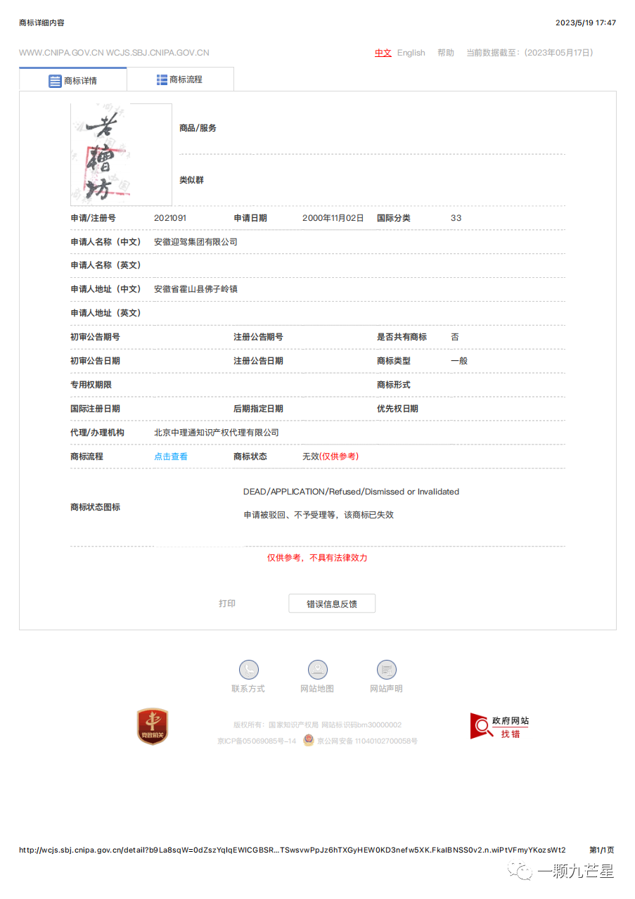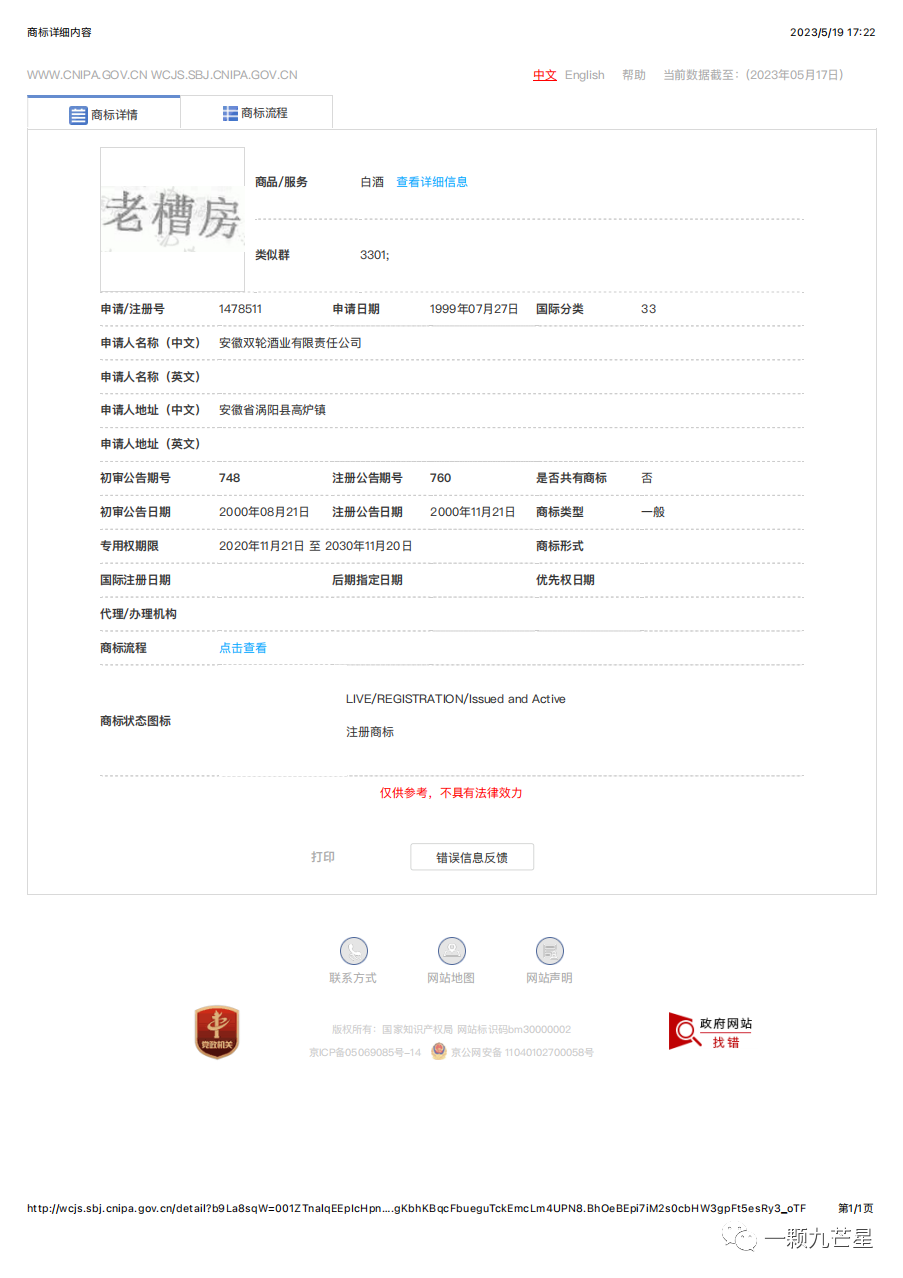 2.本案过后,安徽双轮酒业有限责任公司也在坚持不懈地在33类申请注册“老糟坊”商标,但是没有成功,其他公司也未注册成功。但是,安徽双轮酒业有限责任公司在其他类别成功申请注册了“老糟坊”。可见,商标的防御注册也尤为重要。