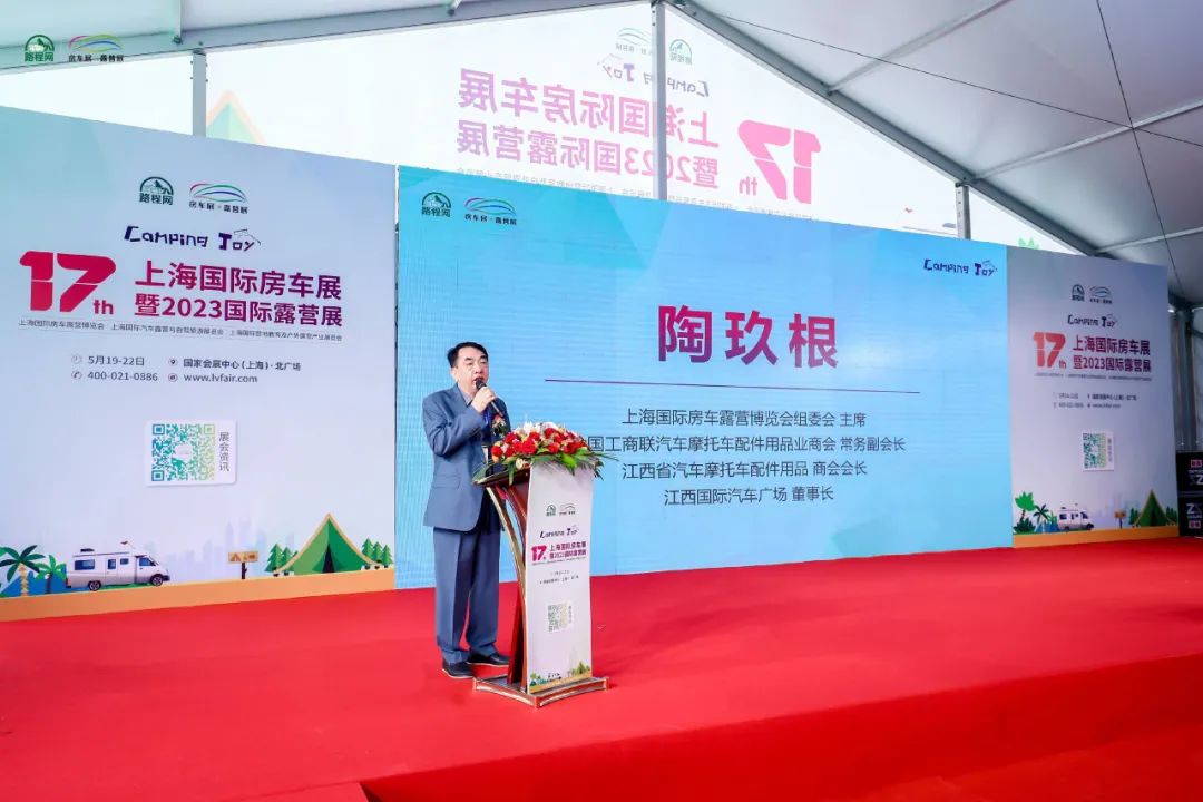 5月19日,由路程网x房车行主办的第 17 届上海国际房车展暨 2023 国际露营展在国家会展中心(上海)盛大开幕。全国工商联汽车摩托车配件用品业商会常务副会长、江西省汽车摩托车配件用品商会会长、江西国际汽车广场董事长、上海国际房车露营博览会组委会主席、2023 中国·江西汽车文化节组委会主席陶玖根,江西省汽车摩托车配件用品商会副会长、路程网X房车行合伙人、江西国际汽车会展中心总经理、2023中国·江西汽车文化节组委会秘书长朱仲升受邀出席本次开幕式。陶玖根会长在致辞中表示,本届博览会将充分展示房车露营生活的新业态,是中国房车露营行业一次全新的探索,围绕着“房车+”的概念,首次打造“房车展+露营展”的双展联动模式,共吸引两百多家展商,参会规模达超过5万平方米,报名参观者超过6万人,展会同期将举办十多场行业活动,精彩纷呈!展会的成功在于厂家的促销让利,在于车友们的热情参与,希望大家都能乘兴而来,满意而归!