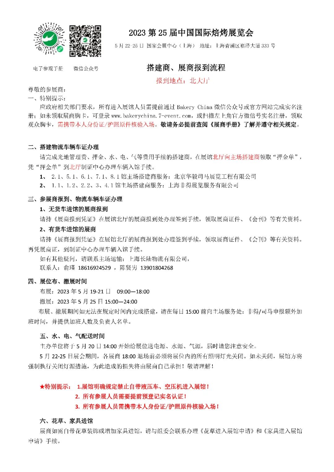 请您携带报到人的名片及已盖章《展商报到凭证》原件到上海虹桥国家会展中心北大厅展商报到处领取参展文件,包括展商胸卡等。