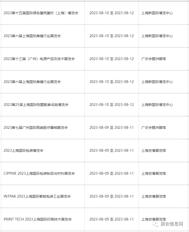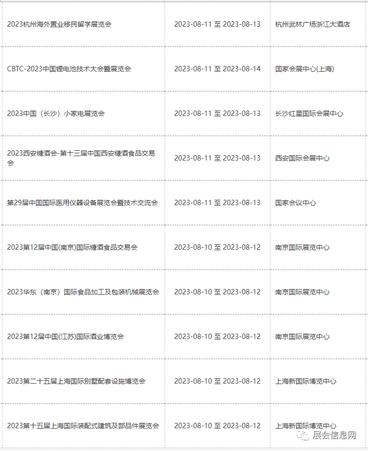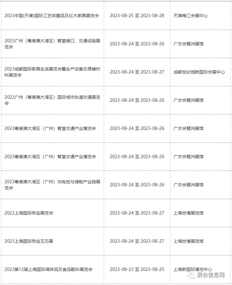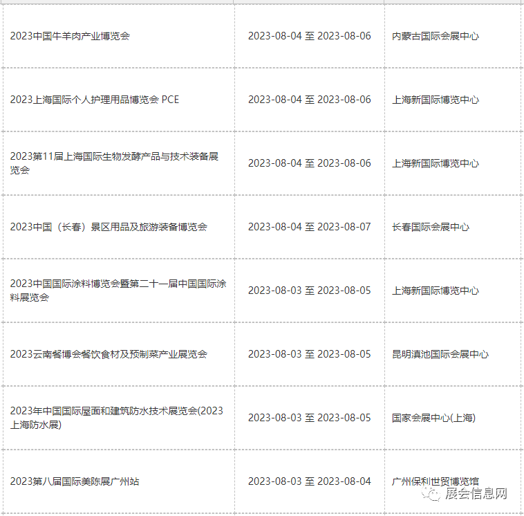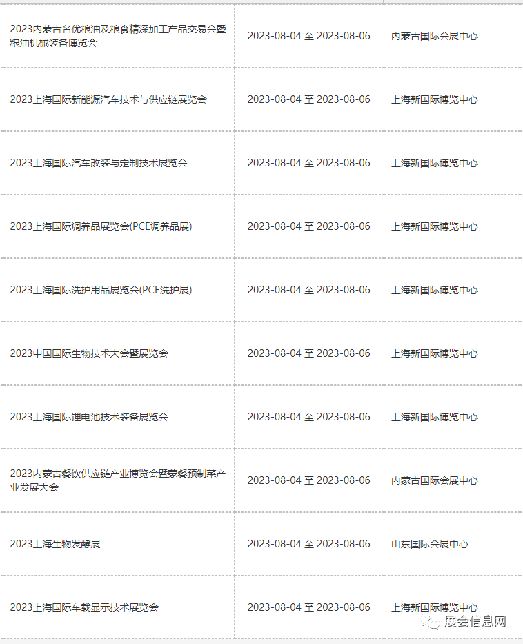 ● 8月份展会信息预报表更新时间为2023年05月19日;