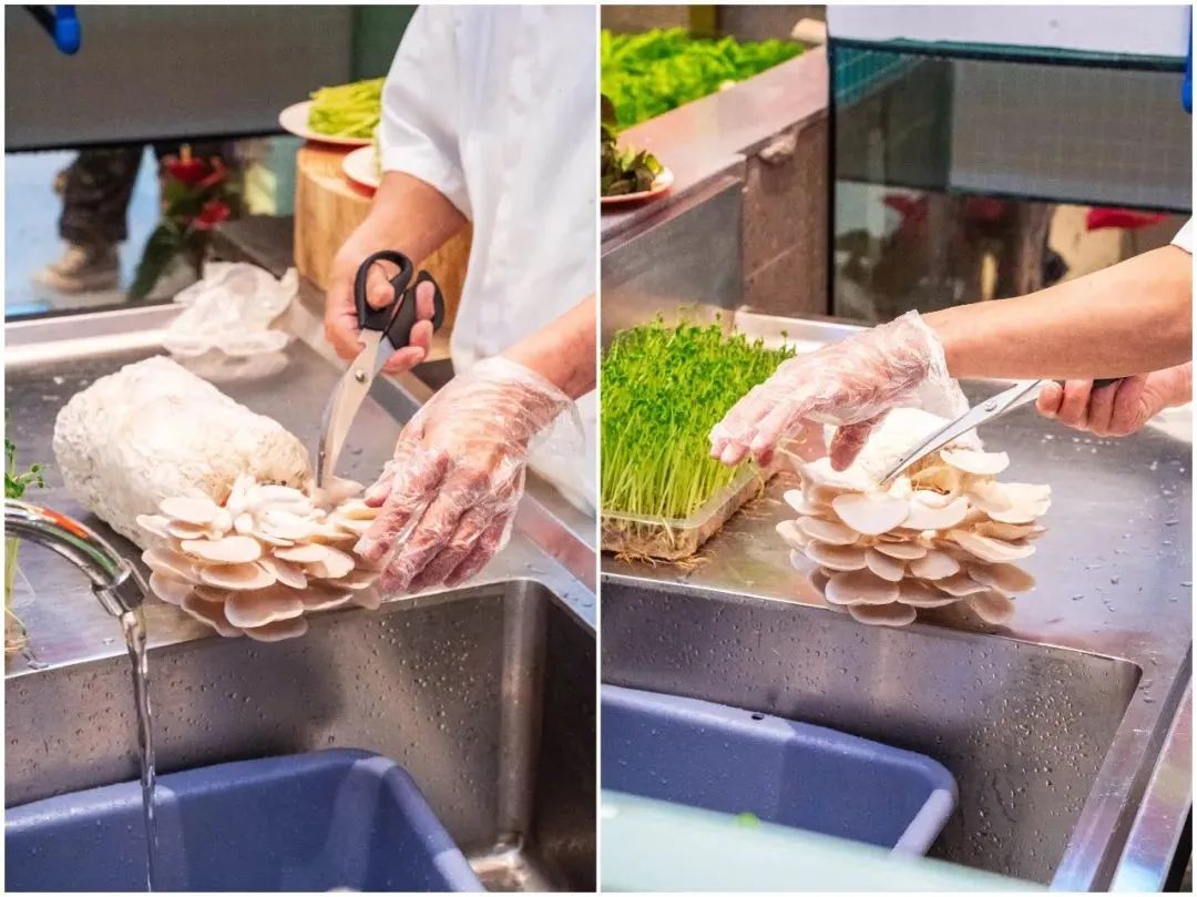 想要品味鲜味?活体菌菇可别错过~菌菇长得很密集,基本没有空隙,师傅们当场制作,用剪刀顺着菌柄剪下就能入锅。完全保留了菌菇的新鲜劲儿,就一个字——鲜~
