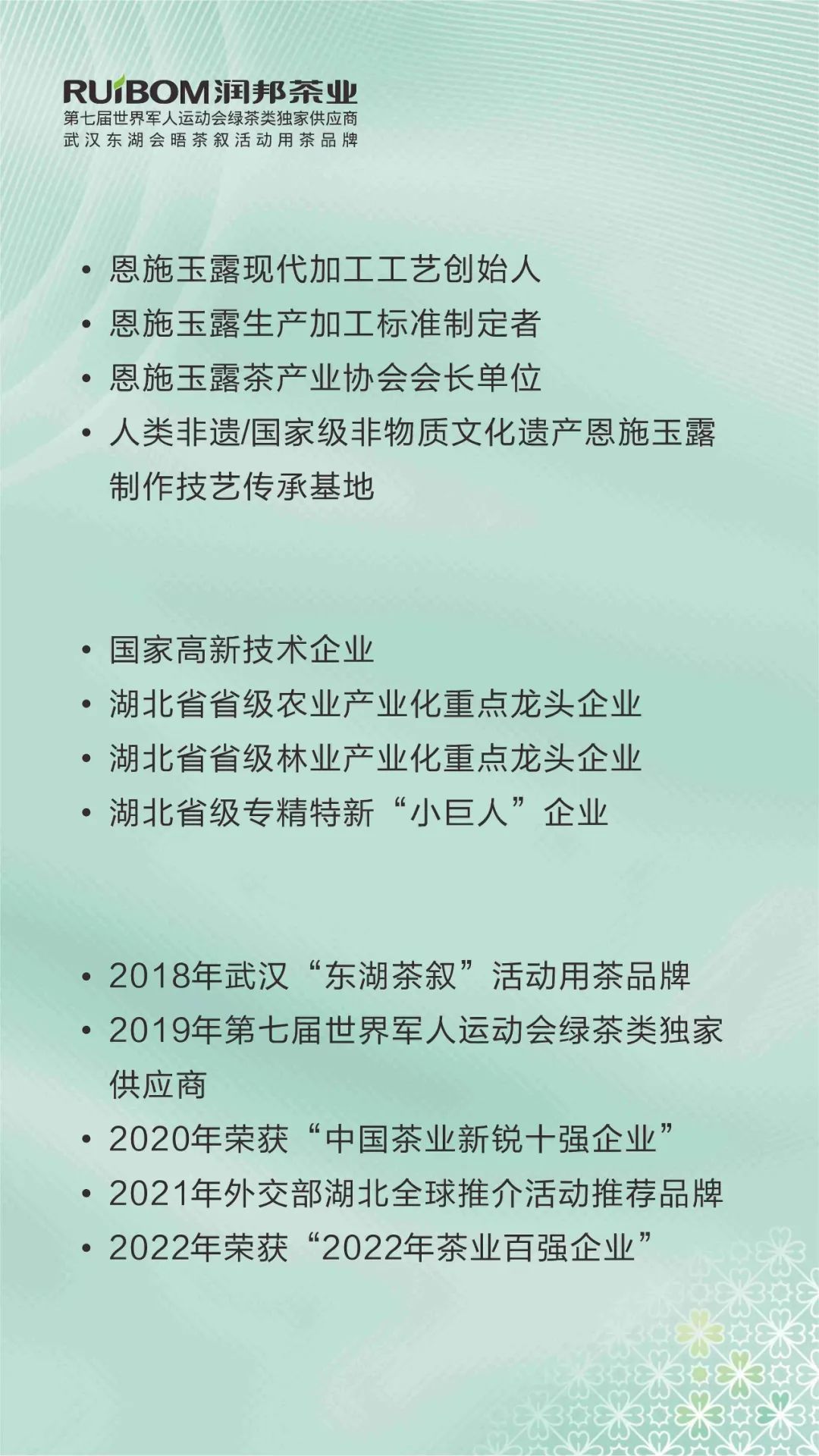 此次博览会润邦茶业在恩施州馆、湖北馆两个展区展示恩施玉露,邀您共品恩施玉露,重走万里茶道!