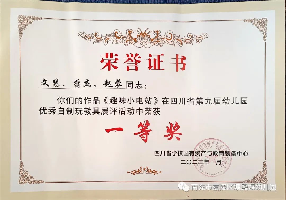 在市、区教科体局领导的引领和指导下,塘殿堰幼儿园老师们精心制作的《趣味小电站》玩教具获得省级:一等奖