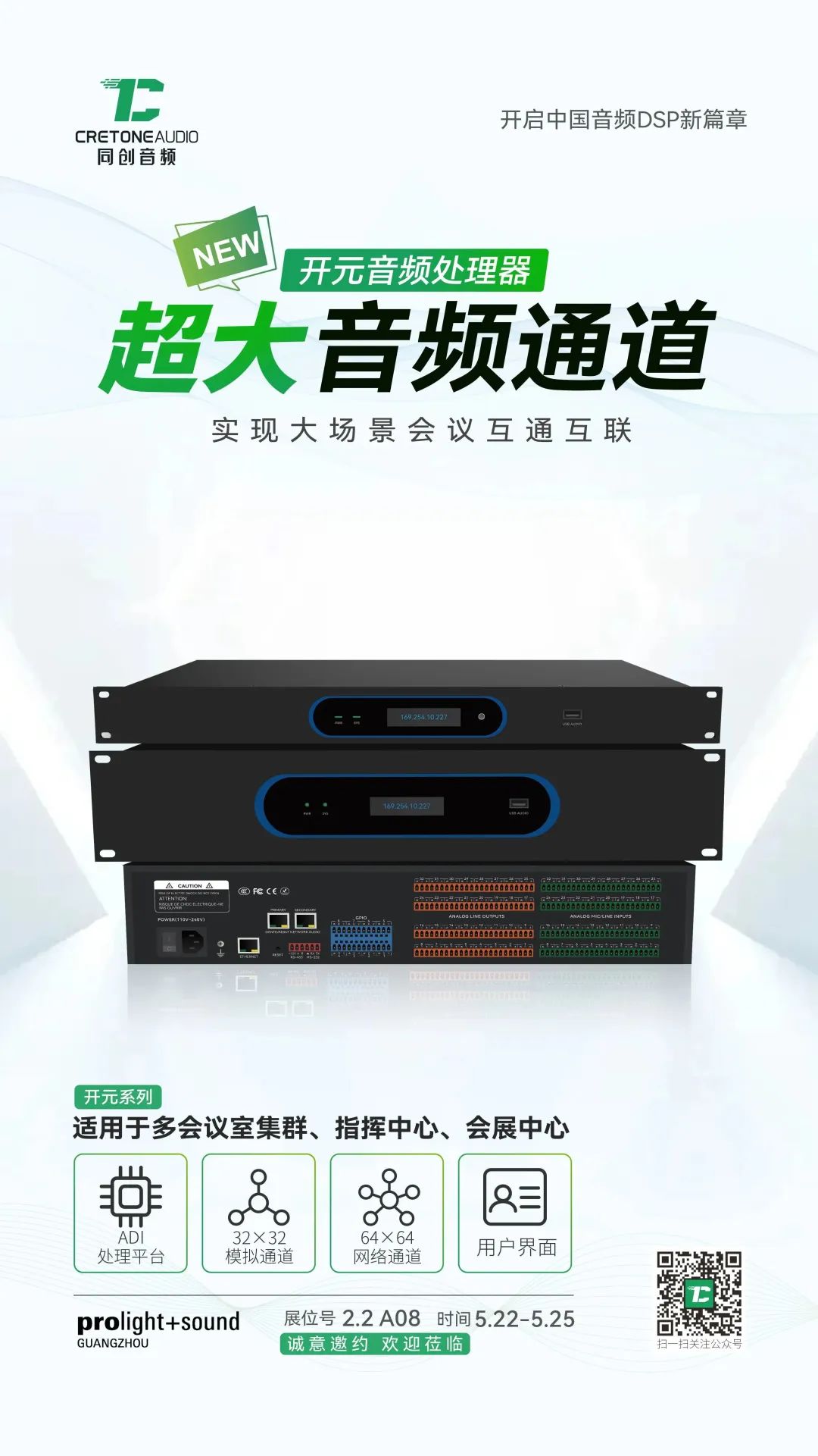 同创音频以创新为灵魂,打造了这款全新上市的开元音频处理器,它不仅拥有出众的声场处理能力,更能最大支持64*64网络音频通道,实现多会议室互通互联,解决大场景会议需求。