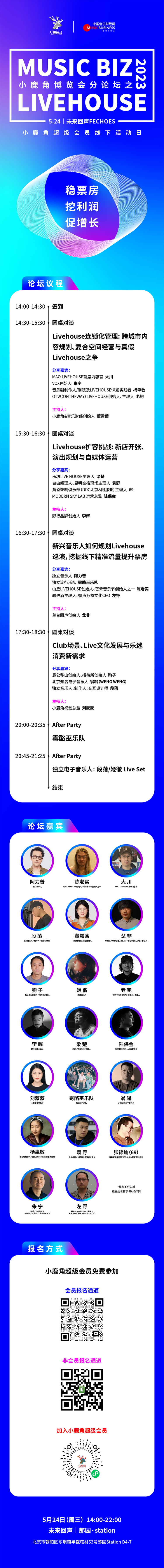 创建于2008,经过十余年的发展,OTW已经成为一家以音乐为主,融合多种文化形态的综合性文化产业机构,历年举办室内音乐现场、剧场演出、文旅演艺、戏剧节、户外音乐节等各类文化艺术活动三千余场。OTW品牌下属DOOBIRDS音乐厂牌、方盒剧社/河妖剧团、脱口秀俱乐部、因乐咖现代音乐体验中心等多个文化艺术团体。OTW旗下音乐厂牌签约、合作三十多组优秀乐队和音乐人,创建并运营华东地区首个省级音乐产业基地——OTW安徽原创音乐基地。2019年,荣获安徽省十大民营演出经纪机构。资深财经媒体人,小鹿角智库首席分析师,2014年创立“音乐财经”,2018年创立“小鹿角APP”。一直以来,我们始终致⼒于以⾏业分析师的敏锐洞察⼒,以⾼品质内容输出为底层逻辑,以图⽂、演讲、视频、报告和书籍等多元化的内容展现形式,服务于⾏业发展,打造流媒体时代下的⼀站式新型智库服务机构。乐坊LIVE HOUSE主理人梁楚。乐坊LIVE HOUSE是一个分享音乐与快乐的文艺展演空间,并在致力成为珠海音乐、演出文化新地标。乐坊LIVE HOUSE位于珠海乐士文化区,拥有专业的舞台灯光音响等硬件设施,以及经验丰富的音乐演出行业运营团队。作为以音乐演出为主的经营性演出场地,成立以来,乐坊LIVE HOUSE一直为国内外音乐家/乐队们提供亲切优质的服务。黄昏黎明俱乐部(DDC北京&阿那亚)主理人:张锦灿(69)北京黄昏黎明俱乐部(DDC, 北京&阿那亚)主理人张锦灿。DDC始于2014年,致力于打造以现场音乐为主的多元青年生活方式空间,主旨定位于“一切在这里发声”,是一家专注于场馆运营、音乐演出、厂牌运营、活动策划以及青年文化生活方式的开放多元文化平台。场地分别位于北京日坛DDC和秦皇岛阿那亚DDC,同时拥有独立厂牌DDL,旨在挖掘、支持和发展更多独立、根源、未来和国家化的声音。从巡演经理到LIVE HOUSE主理人,部分演出项目的经验包括:2023年杭州“聚橙梦响音乐节”、2022年Sunnee杨芸晴“心”2022全国巡演、2022年Psy P杨俊逸2022“风靡一时”全国巡演、2022年网易云音乐“云村营地音乐节”重庆仙女山、昆明长湖;2022年首届全国LiveHouse行业论坛;2021年Subs X 阿达娃《共感》;2021年乃万NINEONE#“Romance/Reality”巡演;2021年School Girl ByeBye“爱是一切”巡演;2017-2019年“叁叁肆计划”巡演(安徽、陕西、宁夏、山东、云南)共计64场的美好。MODERN SKY LAB 是以摩登基因与审美系统为内核的生活方式线下实体店,是城市青年人特立独行的表达空间,是具有驱动力的青年文化聚集地。现有上海、昆明和重庆等多家经营主体。李辉作为唱片行业的资深从业者,曾任京文唱片的总经理,多年来,一直践行在创业路上。近年来,李辉创立了野行品牌,致力于探索音乐文旅解决方案。阿力普,一位来自新疆的80后维吾尔音乐青年,独立音乐人,民谣唱作人,SweetLip乐队主唱。游走在Folk与Indie rock之间,是一位温暖敏感的民谣暖男。2006年成立小熊饼干乐队并担任主唱,创作了一系列优秀的作品。霉酪巫(Mildew)乐队是来自北京的独立流行乐队。乐队成立于2019年,由三位集拖延症与强迫症于一身的主唱/吉他:小六 贝斯:李晓晨 鼓:小建组成。主唱兼吉他小六,2014年开始学习电吉他,2015年开始尝试写歌,2017年进入现音学习电吉他专业,擅长Funk、R&B、Soul 等风格演奏,于2019年成立了霉酪巫乐队并负责创作和编曲。乐队融合 Funk Jazz Neo-soul 等音乐风格。你可以在霉酪巫的歌曲中感到funk的激情,也能在Chill的律动中享受温柔, 舒缓的旋律治愈你的焦虑并诉说着浪漫,有机会一定要去看看现场,他们独特的气质,过耳不忘的旋律会让你忘掉烦恼。霉酪巫Mildew2022年登陆西南偏南SXSW音乐节,是目前世界上规模最大的音乐盛典之一。山丘LIVE HOUSE创始人,也是芒禾音乐节的创始人之一。山丘LIVE HOUSE品牌创建于2015年,致力于打造苏州最专业的音乐现场,推动原创音乐和现场音乐的发展。目前在苏州有三家店,分别位于高新区红唐购物中心,工业园区新光天地,工业园区斜塘老街。百万级灯光音响舞台设备,专业的灯光音响团队,先后承办过超过近千场的现场音乐演出。现三家场地均可承办各类演出、聚会、年会、沙龙等。左野,疆进酒·OMNI SPACE创始人,微声万象(OMNI MUSIC)文化CEO。经过六年多的运营,疆进酒·OMNI SPACE已成为北京地标性音乐展演空间。2022年,OMNI团队在北京打造了新型双元Live场馆东市·OMNI CLUB。今年,疆进酒·OMNI SPACE更是以双馆空间模式落地广州并开始运营。与此同时,OMNI团队成立了独立音乐厂牌VIBEZ万是音乐,签约多组另类摇滚音乐人,并成立了OMNI STUDIO录音工作室,为音乐人提供技术与制作服务。草台回声创立于2016年,是一家以高品质原创音乐、泛艺术类活动为核心内容的新晋独立音乐厂牌。厂牌旗下签约艺术家有声音玩具、莫西子诗、秘密行动、Mr.Miss、斯斯与帆、KAWA、完美倒立、电气樱桃、海尾巴等。