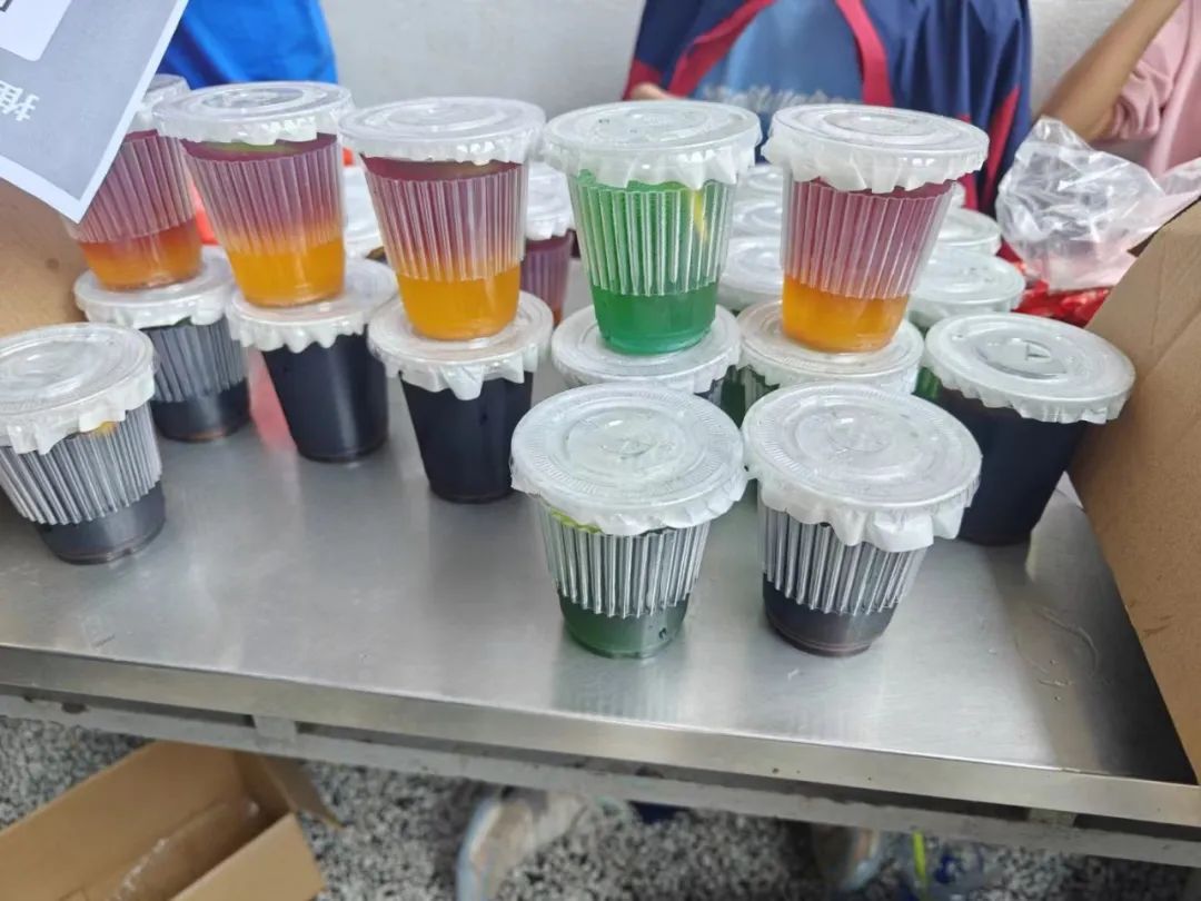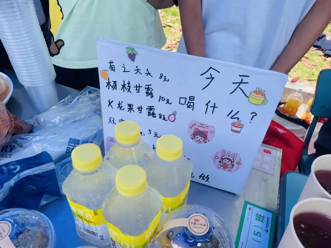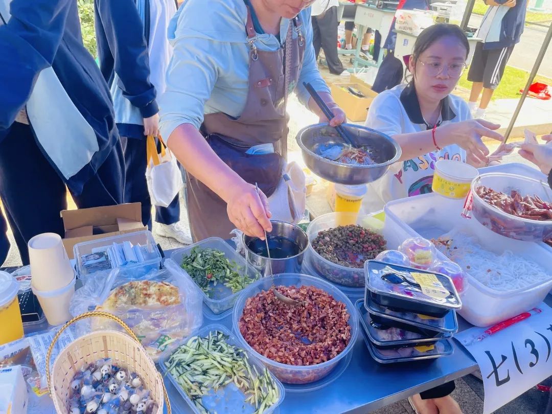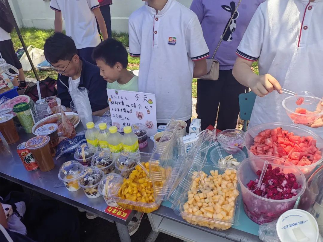 各位摊主们就更忙碌了,面对着摊位前熙熙攘攘的顾客,一边要制作美食,一边又要安抚顾客耐心等待,真是忙碌极了!家长们和老班们跟着孩子们一起忙碌吆喝,为着同一件事而努力。
