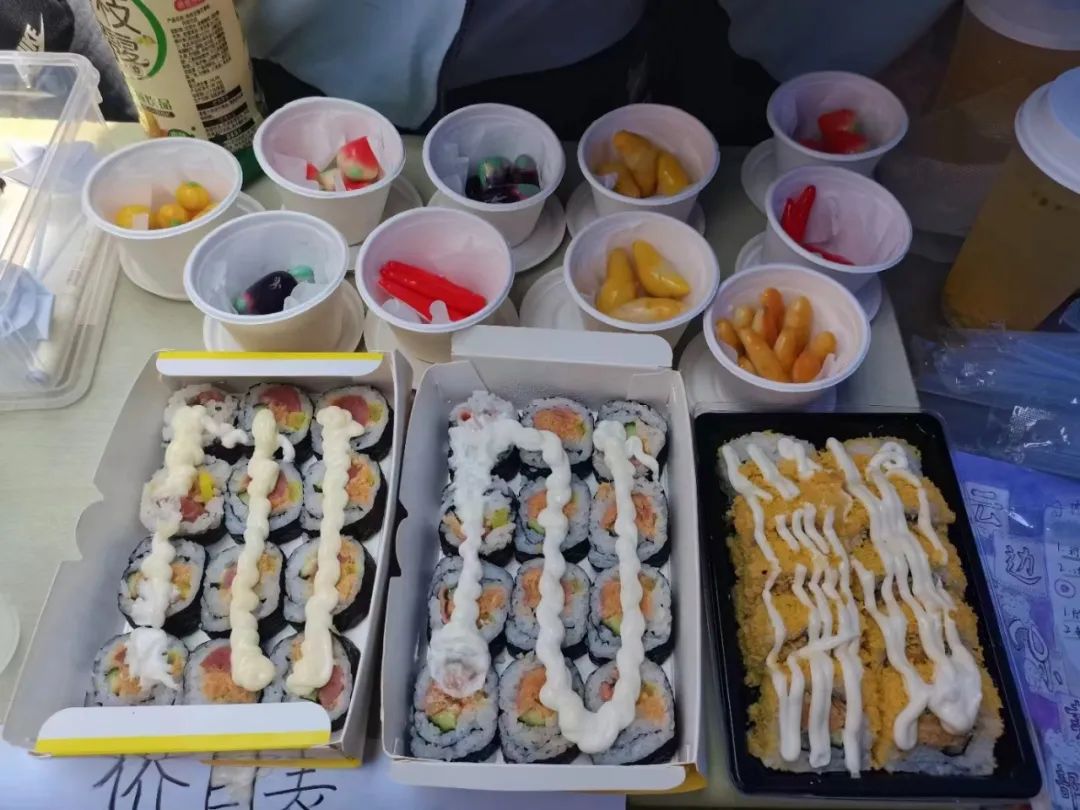 走进每个摊位,小龙虾、粉干、凉皮、鸭头、冰粉、寿司、布丁、各式糕点......让人目不暇接,垂涎欲滴。