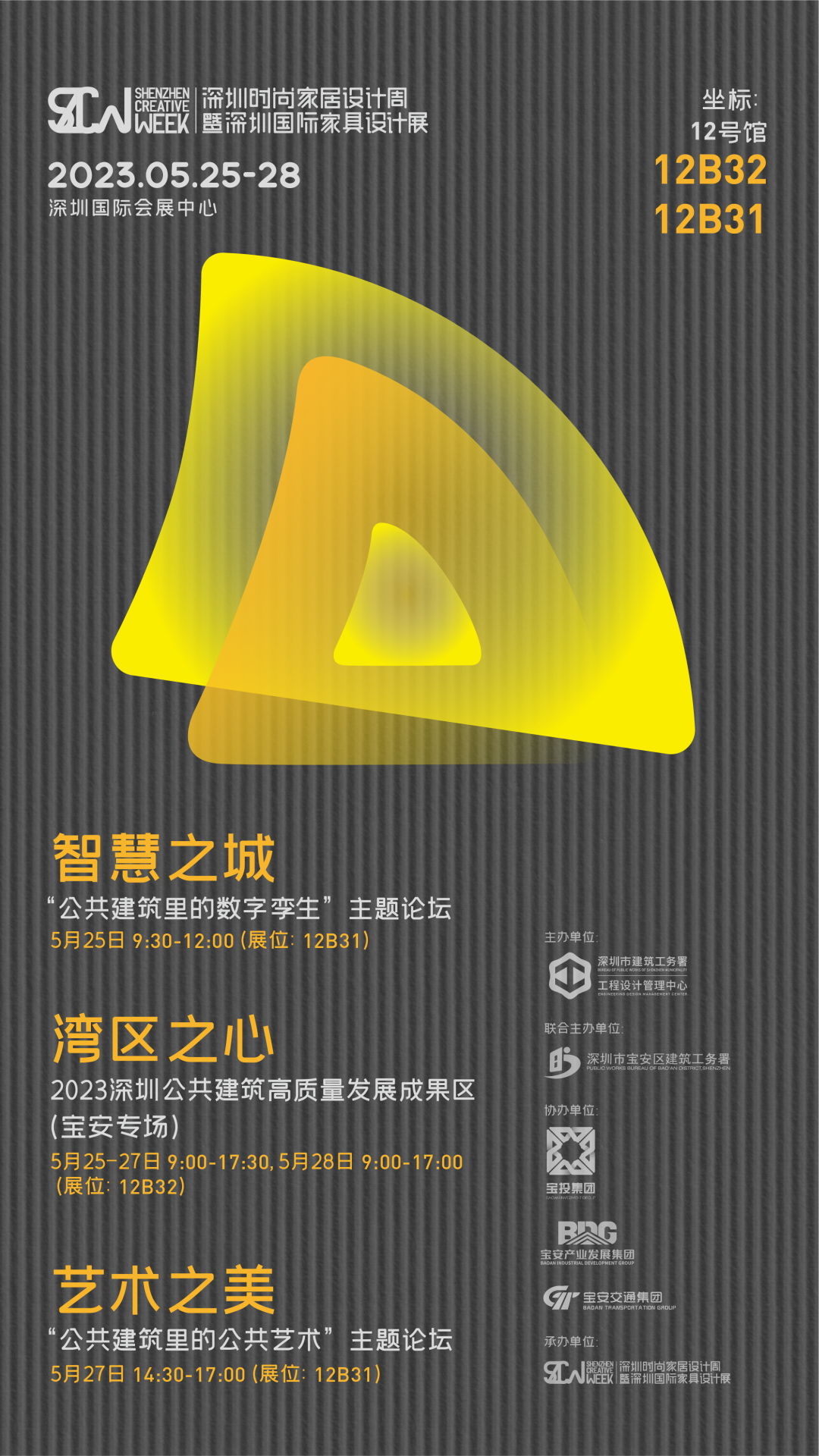 由深圳市建筑工务署工程设计管理中心及深圳市宝安区建筑工务署主办,深圳市宝安区投资管理集团有限公司、深圳市宝安产业发展集团有限公司、深圳市宝安交通投资集团有限公司等三家宝安区“工业上楼”项目主力国企联合协办,由深圳时尚家居设计周公建设计发展联盟承办。本次活动分为“智慧之城”和“艺术之美”两场论坛及“湾区之心”特色展区,聚焦“数字孪生”“公共艺术”“文化/教育/康养”“BIM/CIM”“工业上楼”等公共建筑核心版块,全方位呈现深圳城市高质量发展成果,传递大湾区美好人居生活正能量。由深圳时尚家居设计周创意总监Ana Rio主创,本次展位的主形象,扇形错落叠加出来的造型,是纯粹的建筑结构设计,不同层次黄色渐变,表达出公共建筑的现代与未来感,瓦楞纸纹理的背景呈现出水的波纹感和大自然的光谱,彰显深圳绿色、时尚、年轻有活力的城市形象。