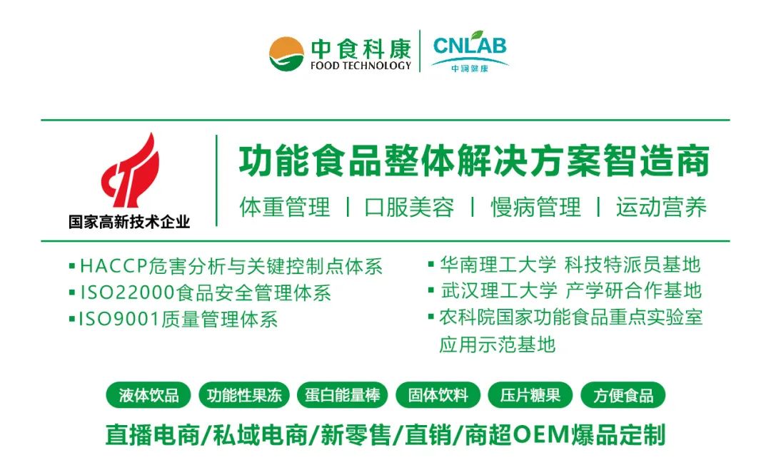中食科康&中澜健康作为“功能食品整体解决方案智造商”,产品覆盖了直播电商/私域电商/新零售/直销/商超OEM爆品定制等主流渠道。并致力于为合作伙伴提供包括市场调研、产品定位、研究开发、生产加工、品质管控、成本管控、仓储物流、营销支持等一站式功能产品整体解决方案。