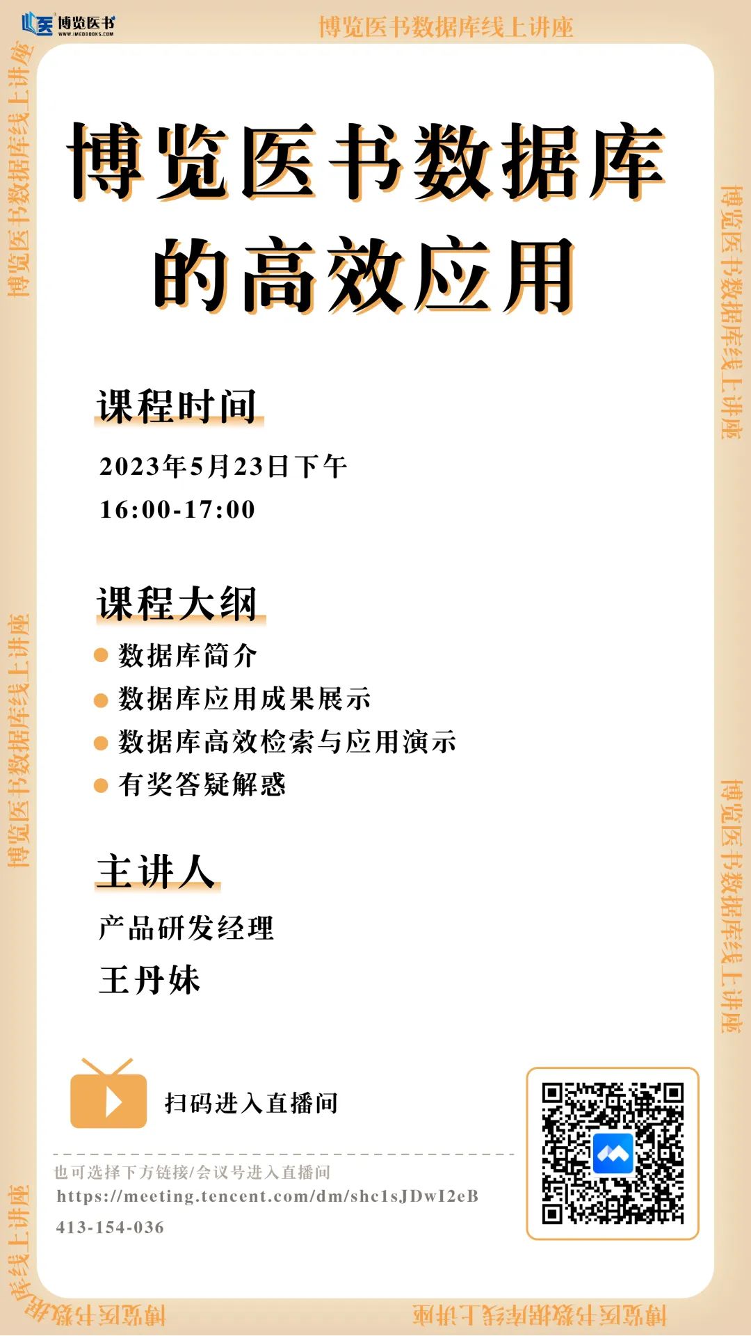 为帮助更多中医专业师生、医院医师、中医爱好者等群体更好体验博览医书数据库功能与应用,实现中医数据精准检索,全面阅读学习中医经典知识,辅助学科建设、科研成果转化、横向课题、课程设计、学业测试、论文研究、考证晋升等,特开展系列讲座提供权威解读和模拟操作演示,欢迎广大师生参与讲座,也可关注博览医书公众号获取专题中医知识和最新中医资讯。
