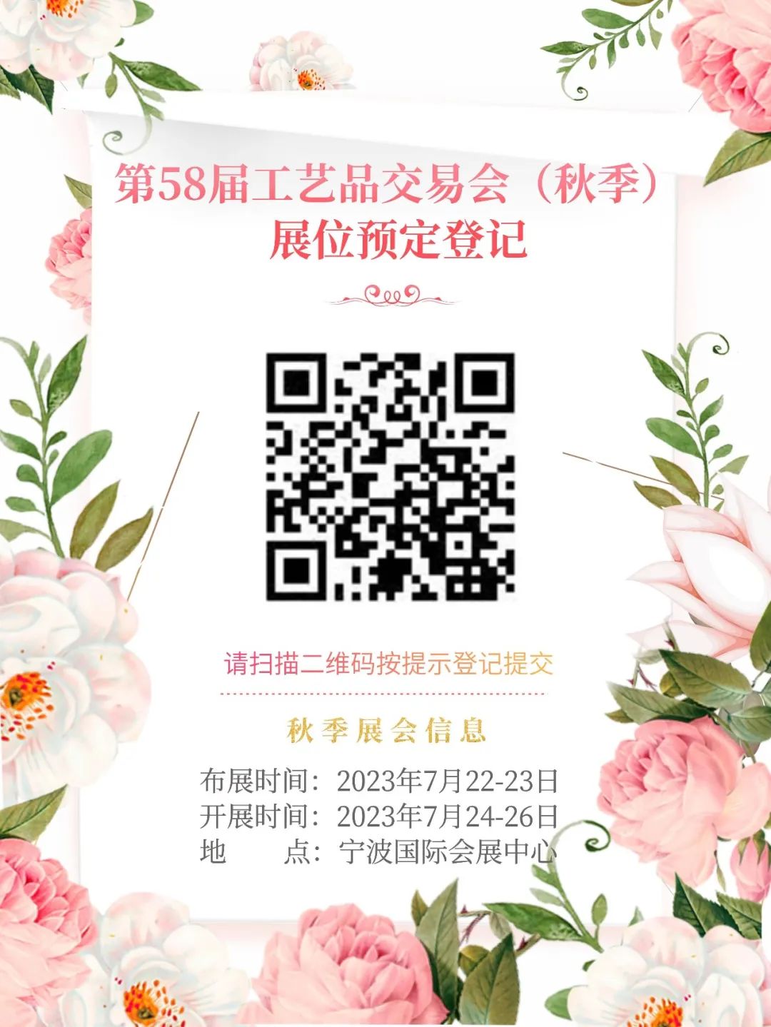 为推动全国仿真植物花卉产业的发展,满足市场需求,为企业和商家搭建更为便捷的展示、交流和商贸交易平台, 中国工艺美术协会拟于2023年7月24—26日在宁波举办第58届全国工艺品交易会仿真植物及配套用品展(秋)(以下简称第58届交易会秋季展)。
