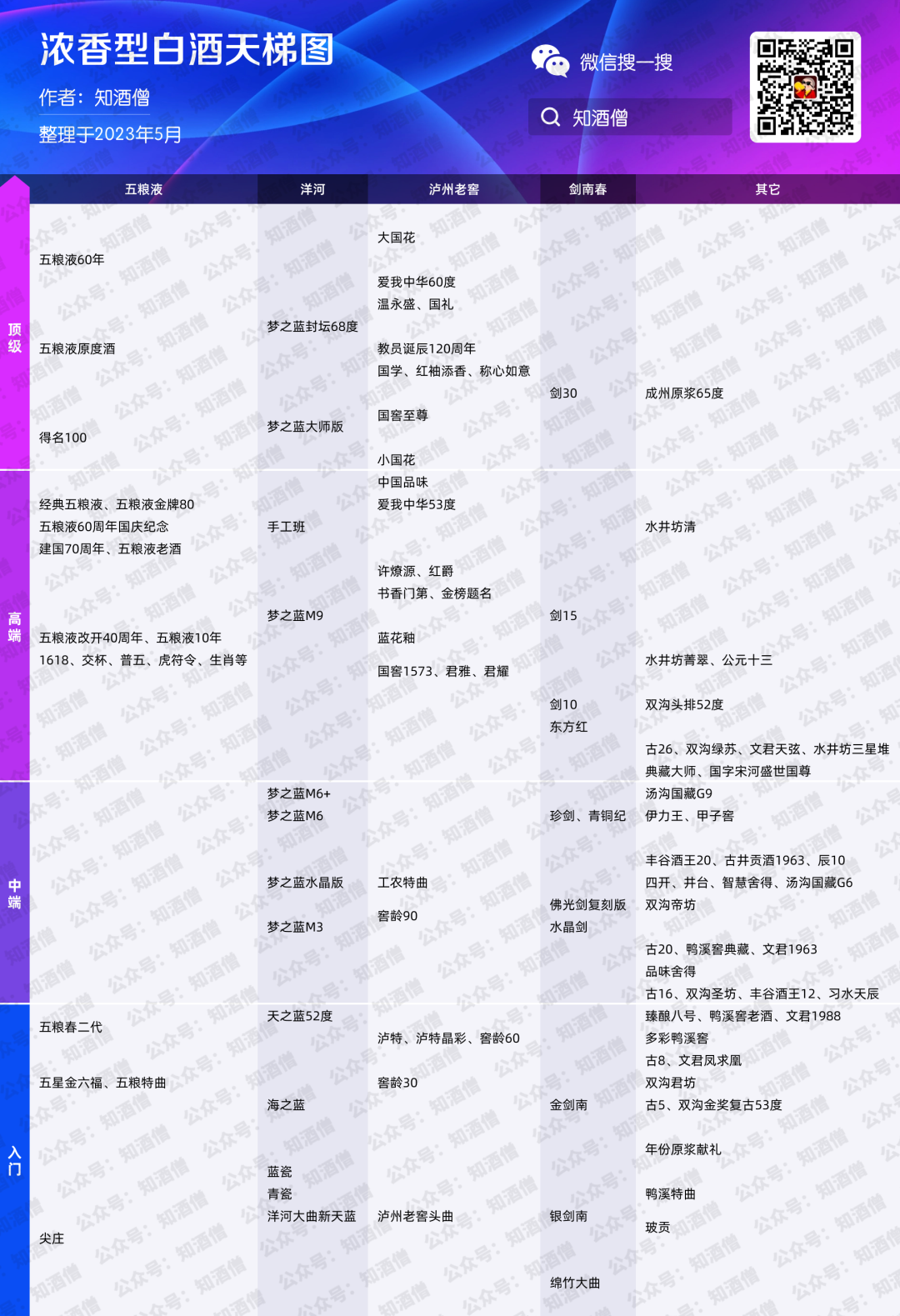 大家可以在公众号“知酒僧”回复“浓香天梯图”获取高清图片。我对酒质的评判主要源自两点:一、品鉴对比,从品鉴的角度判断优劣;二、畅饮进度,比如多人同场喝多款价位相近的酒,喝得越快的酒说明越受欢迎,也证明其越优秀。经常品酒玩的人大多有类似感受,细啜慢饮的品鉴与拎壶冲的豪饮,同样的酒会带来截然不同的体验。开几瓶酒,几个人一起喝,率先喝完的前三瓶基本就是排名前三的酒,哪个瓶子剩的酒最多,差不多也可以定性为该场最差。这种小样本数据的测试方法虽不够精确,但比半吊子酒评给出的带有浓厚个人喜好和屁股倾向的结论要准确多了,因而我在排天梯图时,既按自己的品鉴感受来,也会参考这种畅饮方法得出的排序。但无论用什么方法和标准,终究是众口难调,永远不会有一个统一的、正确的答案。假若天梯图里有任何一款酒的排名与您的体验不一致,皆以您的切身体会为准。