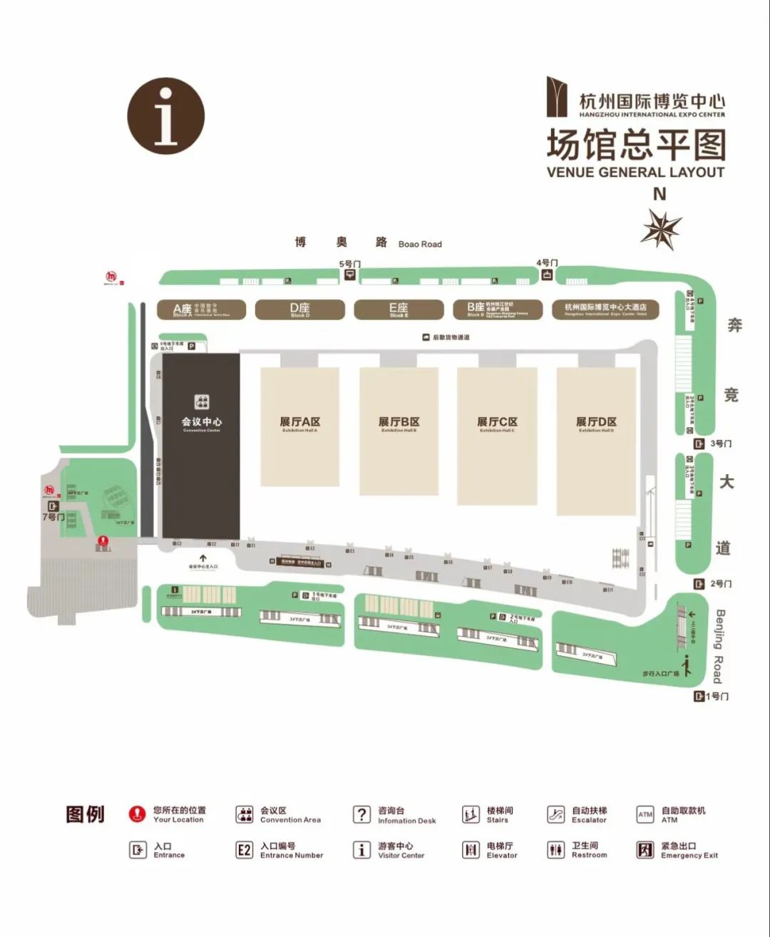 从6号线博览中心站D口出,进入杭州国际博览中心7号门,经身份核验安检后进入场内。