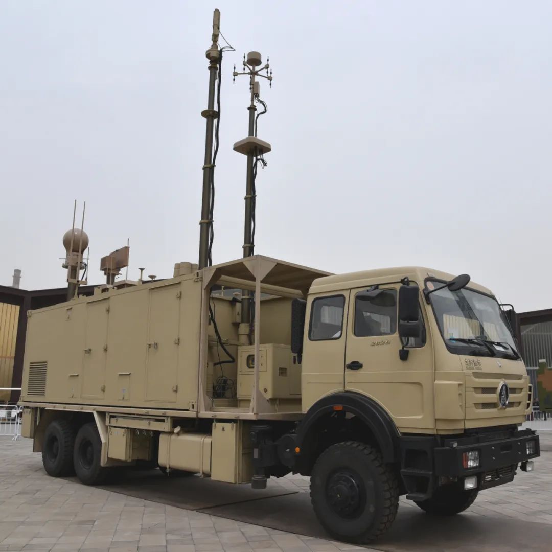既然叫做综合反无人机系统,其自然采用了多样化的探测及干扰手段,因而该车后部的功能舱部分升起了多达4个顶置各种设备的升降桅杆。首先是靠近车头方向的两根较高的桅杆,其顶部分别安装了一个带有五个支臂的测向天线和一个接近平面三角形的定向天线,其中测向天线负责对360度范围内的无人机目标进行探测,侦测距离可达8千米,而定向天线则通过旋转对准目标并实施干扰压制,干扰距离也可达8千米,这两套装置共同可完成200M到8000MHz内无人机目标的全频段侦测和干扰,能有效应对非典型型无人机目标。而在靠近车尾较为低矮的桅杆上则安装有二合一球头光电探测设备和三坐标搜索跟踪雷达,二者作为综合探测手段中的组成部分均采用了可回转的平台。其中二合一球头光电设备采用白光和红外相结合方式,自动完成对目标的跟踪与识别工作,其最大跟踪距离可达5千米,最大识别距离可达3千米,同时该套设备还可进一步升级为三合一光电探头,增加一套具备5千米测距能力的激光探测窗口。而三坐标搜索跟踪雷达则工作在Ku频段,其典型工作频率在12至18GHz,工作波长在2厘米上下,具备分辨率高、精度高、灵敏度高等优势,非常适合对无人机类目标的探测,此处的这个搜索跟踪雷达对中小型无人机目标探测距离可达8千米。
