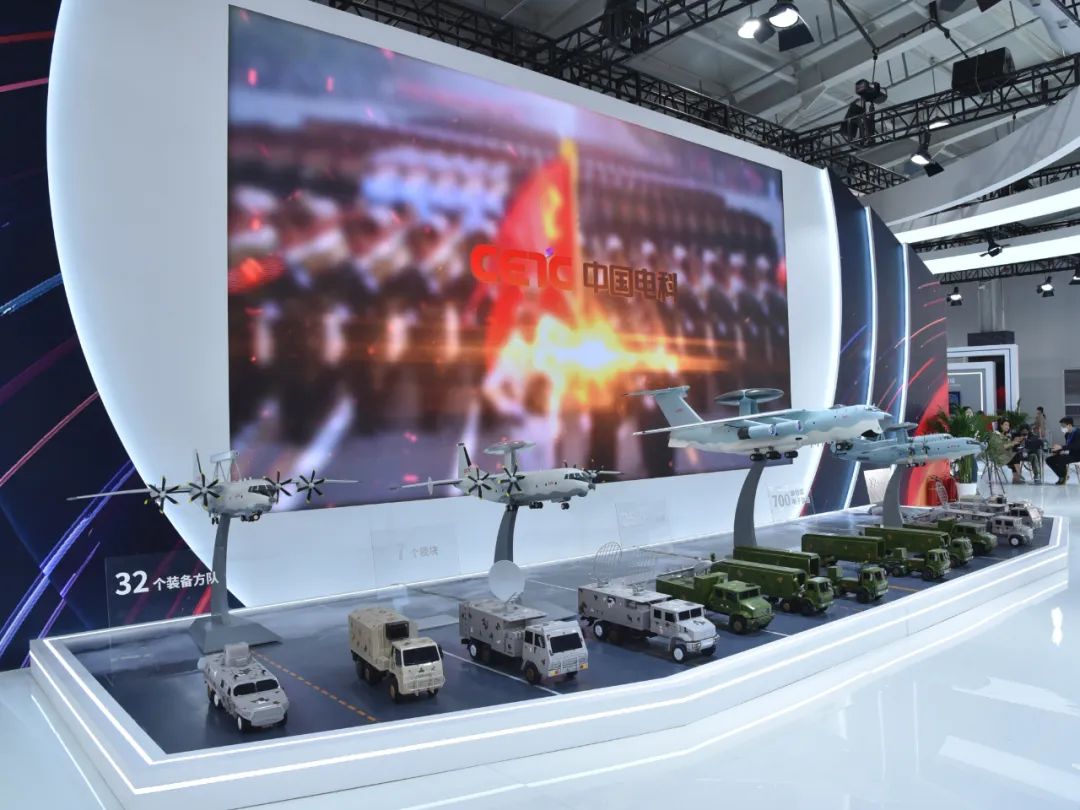 中国电科展台正中的模型和滚动播放的阅兵画面体现了其超凡的实力