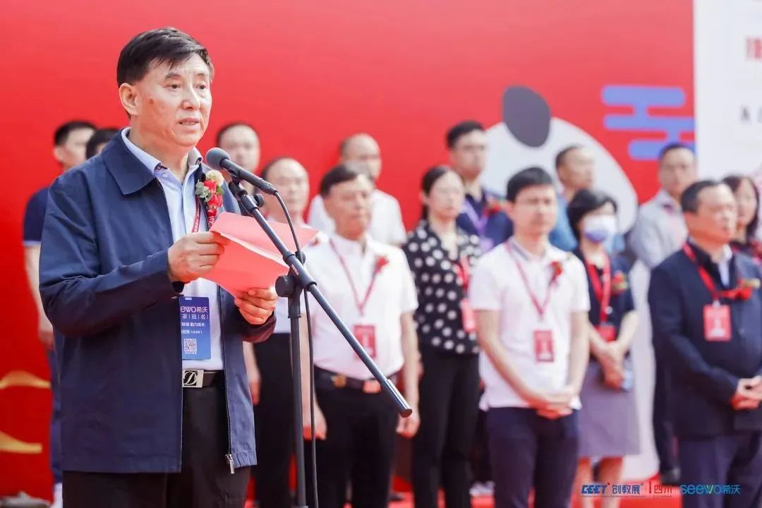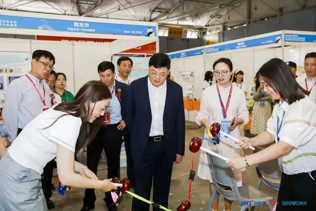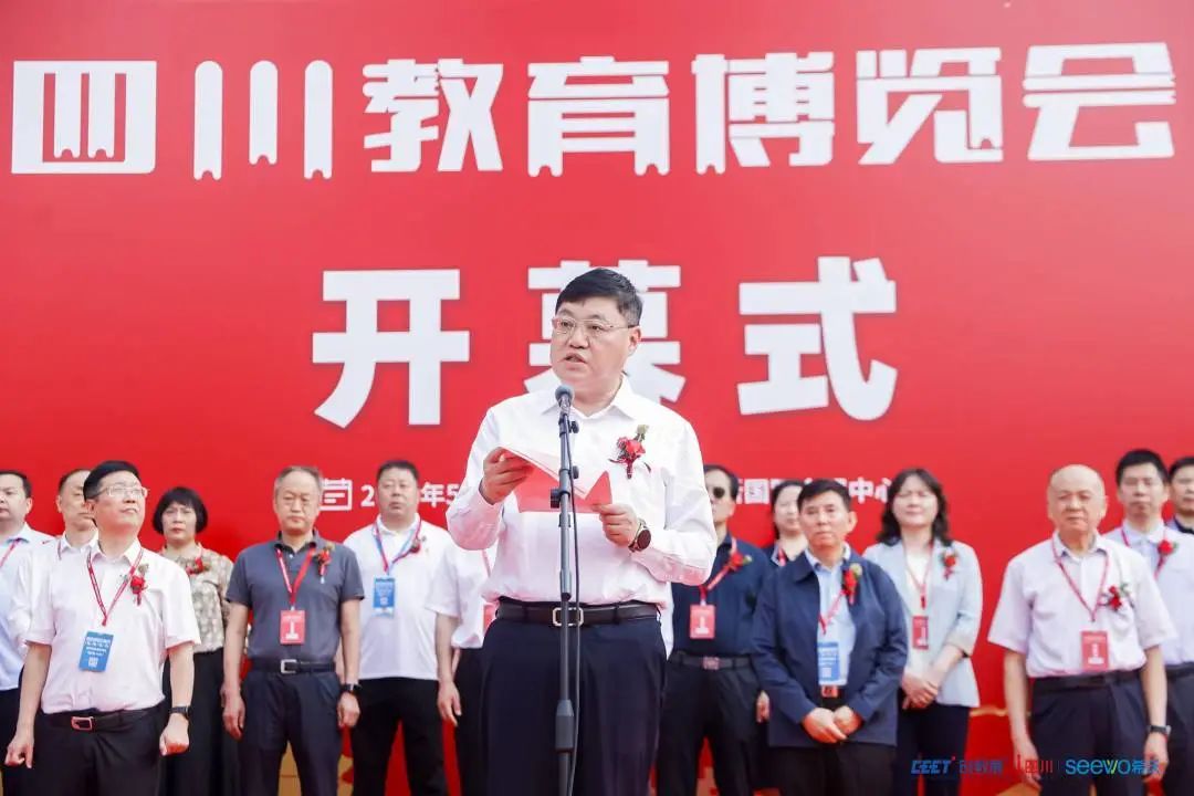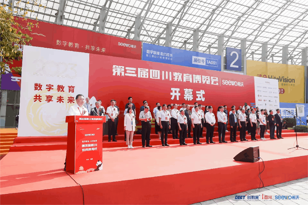 中共四川省委教育工委副书记,教育厅党组成员、副厅长崔昌宏,中国教育装备行业协会常务副会长夏国明,四川省教育装备行业协会会长张林祥,遂宁市人民政府副市长张智勇,河北省教育装备行业协会会长郭国维,四川省中小学后勤协会会长李卓明,四川省教育学会副会长周雪峰,四川教育装备行业协会副会长杨成林,四川省经济和信息化厅大数据与信息化处副处长金文彬,中国教育装备行业协会城市教育装备工作委员会理事长乔玉全,中国教育装备研究院常务副院长、北京师范大学智慧学习研究院特聘专家施建国,中国教育装备行业协会会展部主任张继芳,山东省教育发展服务中心主任魏光祥,河南省教育后勤协会副会长姜燕,河北省教育装备行业协会监事长郭晋保,河北省教育技术中心副主任陈京,内蒙古自治区教育装备技术中心(内蒙古自治区电化教育馆)副主任(副馆长)郝文婷,河南省教育资源保障中心副主任孙艳红,重庆市教育信息技术与装备中心党委委员吴廷祥,深圳教育装备行业协会会长彭锦环,河南省教育装备行业协会会长林忠培,重庆教育装备协会会长谭中长,攀枝花市教育和体育局党组书记、局长李福惠,遂宁市委教育工委书记、市教育体育局党组书记、局长王松,德阳市教育局副局长吴艳,绵阳市教育和体育局副局长古奇,绵阳市财政局党组成员、副局长杨彦彬,广元市教育局副局长杨元,南充市教育和体育局副局长何虎,巴中市教育和体育局党组成员、机关党委书记任志慧,资阳市委教育工委委员、市教育和体育局党组成员、副局长刘绪国,自贡市教育科学研究所原馆长李甘牛,泸州市教育技术装备管理所所长罗刚,广元市教育技术与电化教育中心主任程勇,乐山市现代教育技术装备处处长曹嘉木,宜宾市教育信息化指导中心主任张醇,达州市电化教育与技术装备中心主任张栩铭,雅安市教育科学研究院信息技术研究所所长赵江,阿坝州教仪站站长董群武,甘孜州电化教育馆馆长杨波,广安市教育技术条件装备管理所副所长鲁阳雄,眉山市教育技术装备站副站长葛飞骏,凉山州教育技术装备所副所长刘昕,本次博览会冠名商视源股份希沃未来教育集团西南营销平台总经理胡鹄飞出席开幕式。四川省学校国有资产与教育装备中心主任王方文主持开幕式。