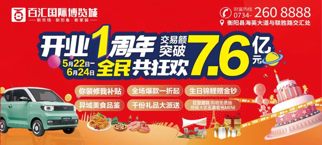 活动期间,百店同庆衡阳百汇开业一周年,品牌门店致谢一城厚爱,全市场内大牌建材家居(见店铺参与活动标识)全新爆款1折起,巅峰让利!单店消费每满3000元,即可砸金蛋1枚,单张订单(单品)最多砸3枚金蛋,100%中奖;数量有限,砸完为止。