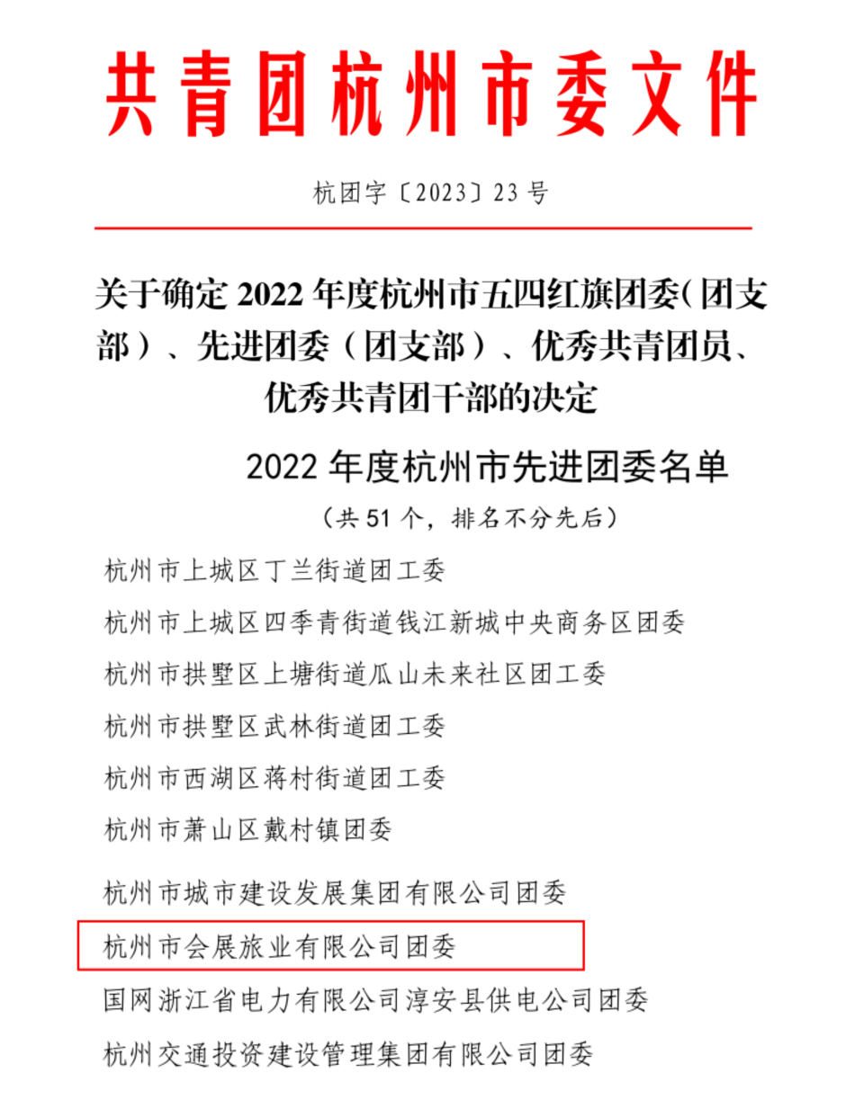 近日,共青团杭州市委对优秀团委(团支部)进行了表彰,杭州市会展旅业有限公司团委荣获“2022年度杭州市先进团委”称号。