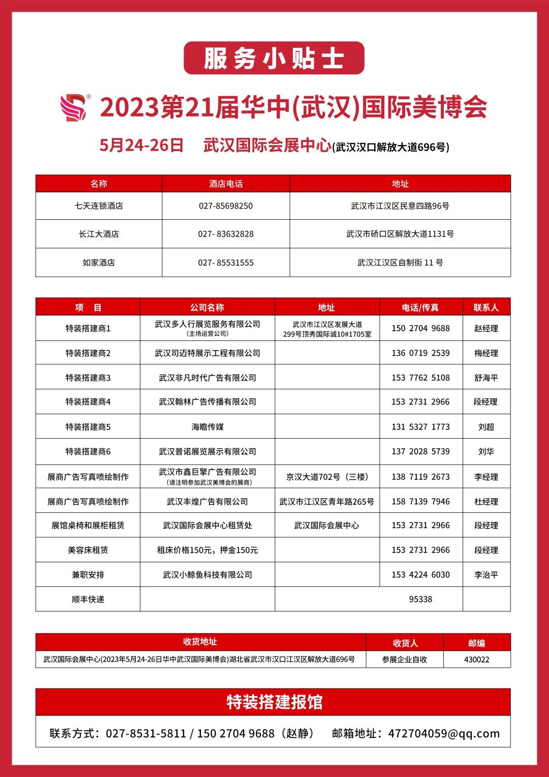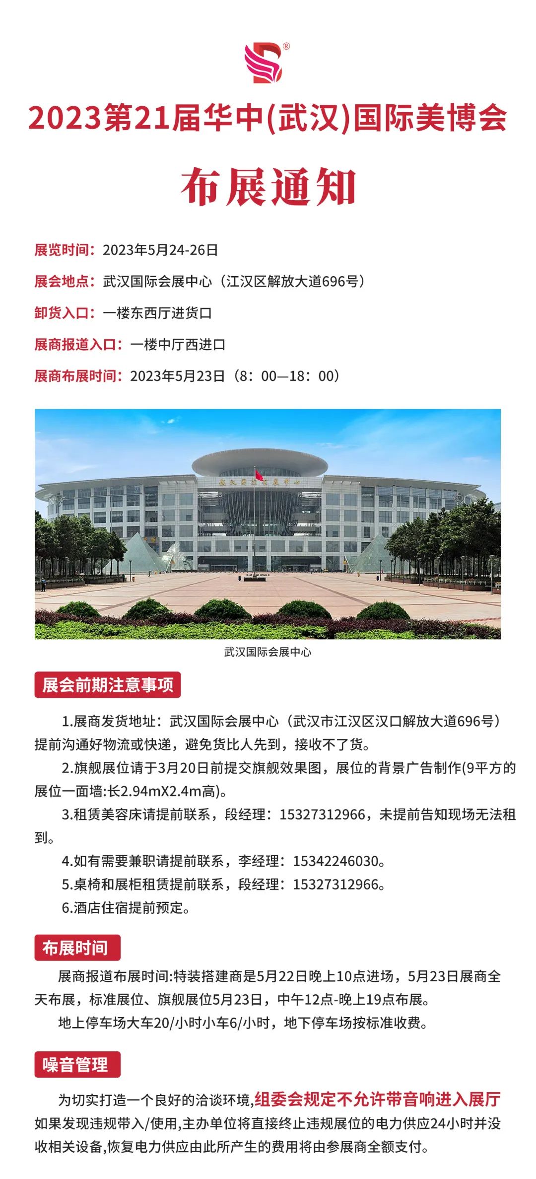 2023第21届华中武汉国际美博会将于5月24-26日举办,展会为期三天,展商需于5月23日完成报道以及布展。本次大会将在武汉国际会展中心举办。