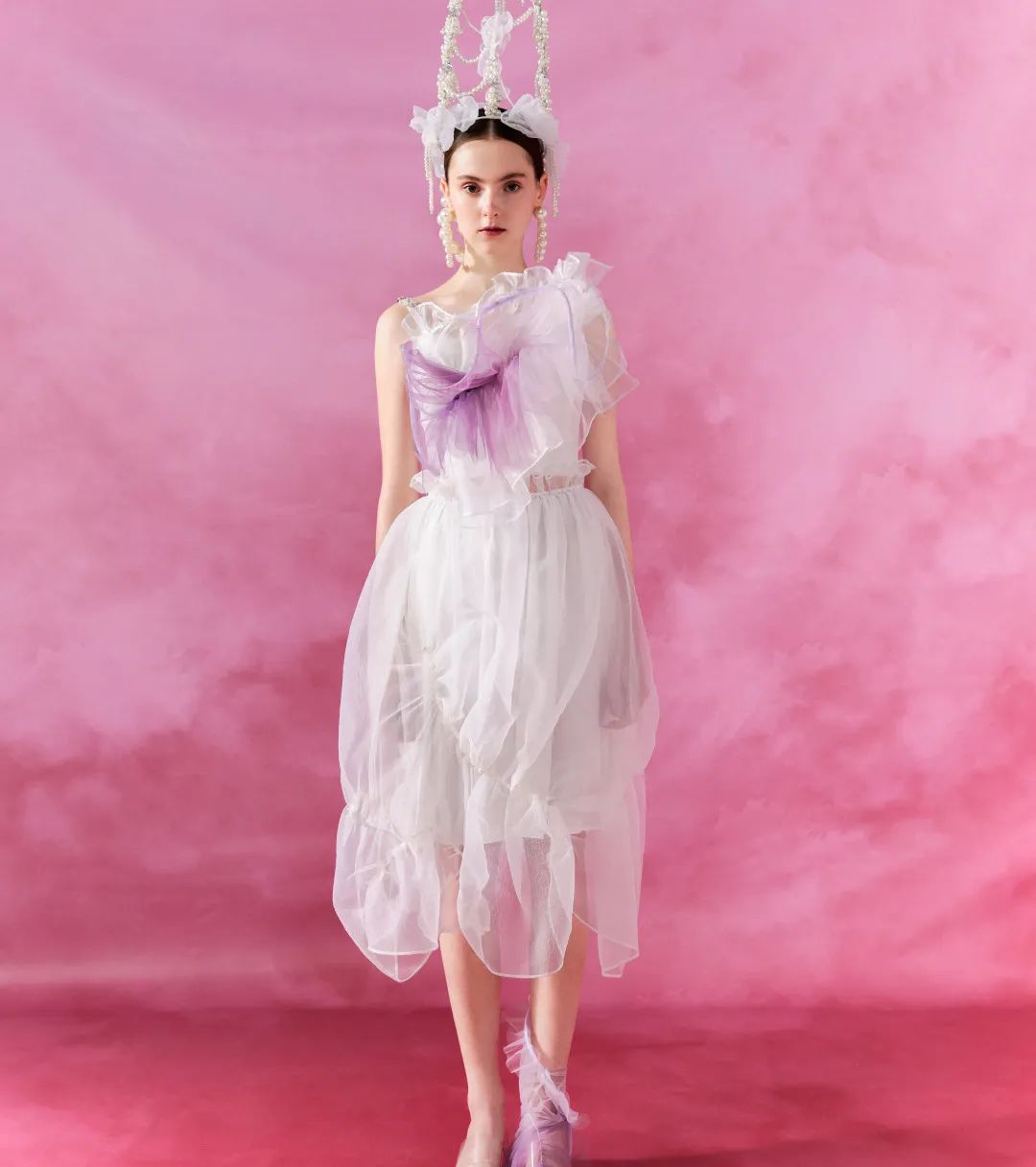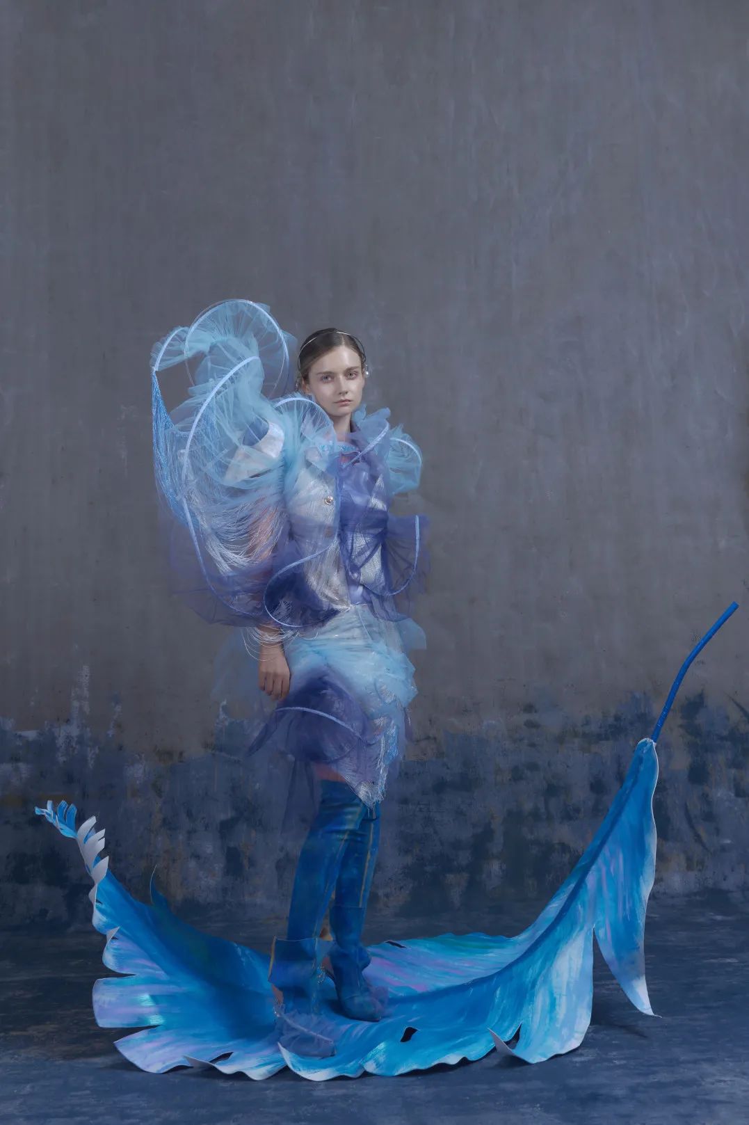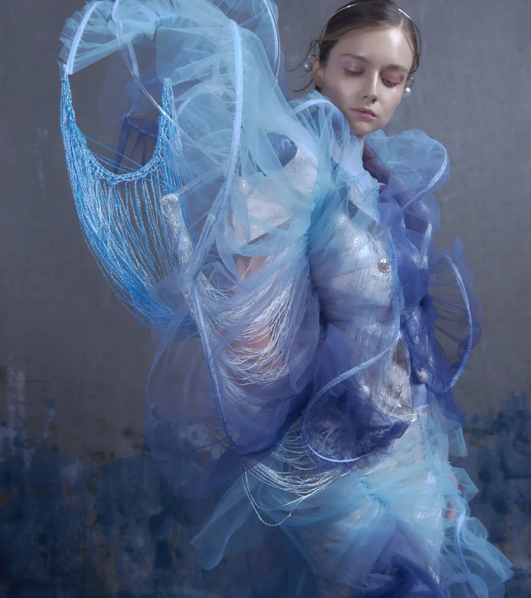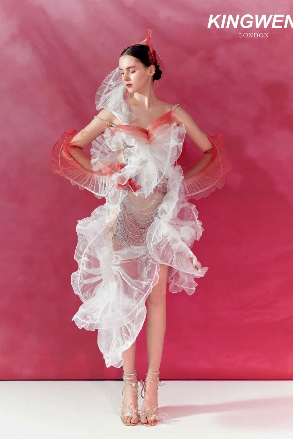 KINGWEN成衣廓形多具有强烈层次感,柔软的渐变网纱与造型鱼骨结合,通过立裁技法,使面料获得自然生机与灵动曲线。拨开纱雾,浪漫气息迎面而来,由外到内,似乎置身于城堡之下,优雅而沉静。而在三亚,这座充满人文情怀的城市里,也有着古典史韵浪漫景象的崖州古城。这所有的都融合在一起,贴合成一个典雅韵味之境。