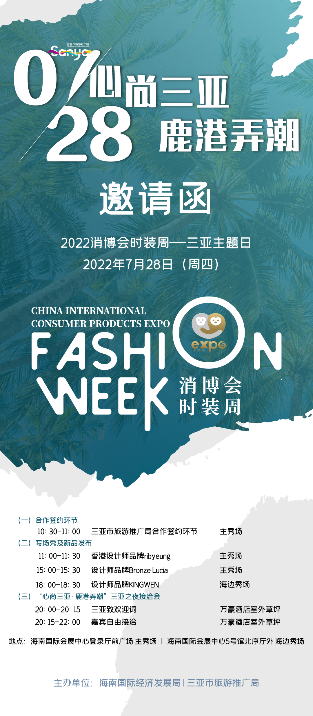 2022年中国国际消费品博览会时装周三亚主题日即将于2022年7月28日(周四)在消博会时装周主秀场及海边秀场与各位时尚弄潮儿们见面,本次三亚主题日将以“心尚三亚·鹿港弄潮”为主题,其中包含三场设计新品首发走秀,分别为香港设计师Ribyeung、设计师品牌BronzeLucia、KINGWEN。