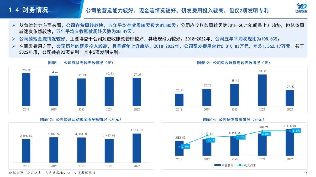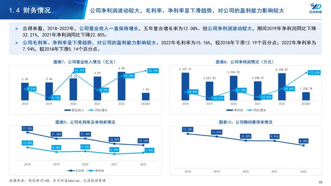2018-2022年,公司营业收入一直保持增长,五年复合增长率为12.08%。但公司净利润波动较大,期间2019年净利润同比下降32.21%,2021年净利润同比下降22.85%。公司毛利率、净利率呈下滑趋势,对公司的盈利能力影响较大。