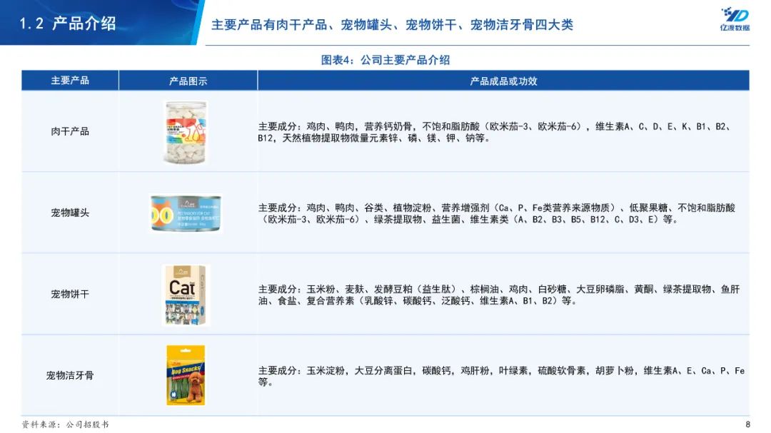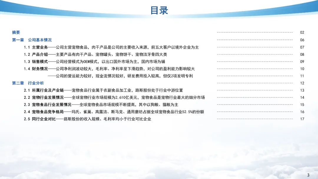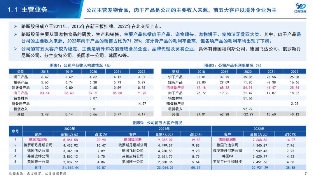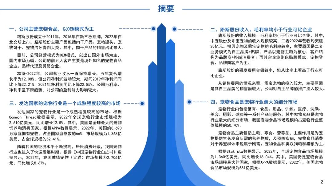 路斯股份成立于2011年,2015年在新三板挂牌,2022年在北交所上市。路斯股份主要产品包括肉干产品、宠物罐头、宠物饼干、宠物洁牙骨四大类。其中,肉干产品的销售占比最大,2022年肉干产品的销售占比为71.25%