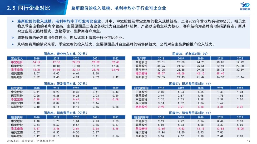 路斯股份的收入规模、毛利率均小于行业可比企业。其中,中宠股份及乖宝宠物的收入规模较高,二者2022年营收均突破30亿元。福贝宠物及乖宝宠物的毛利率较高,主要原因是二者业务模式为自主品牌+贴牌,产品以宠物主粮为核心,客户结构为品牌商+终端消费者;而其余企业则以贴牌模式、宠物零食、品牌商客户为主。