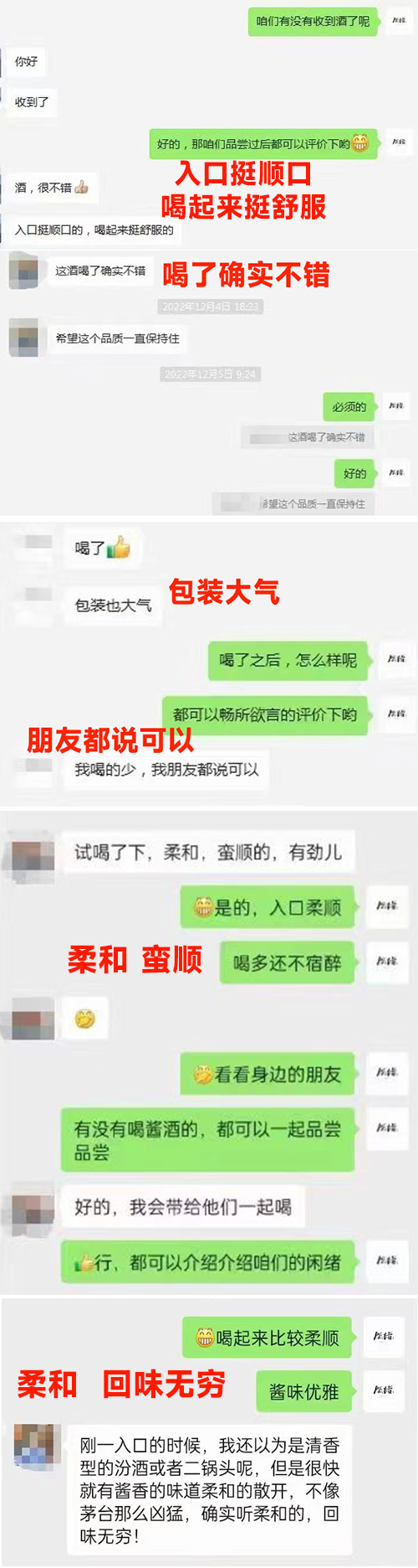 品尝一口,回味有粮食的芬芳和柔顺的甘甜,不上头不辣喉,后味绵长,喝再多也不上头、不口干,不容易宿醉。