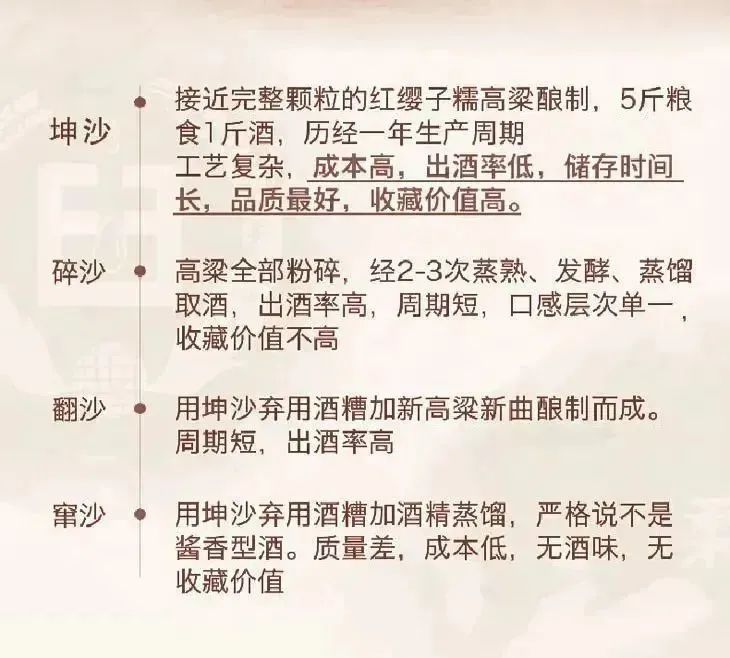如今有些厂子过度追求出酒率,会将其他酒厂取过坤沙酒的高粱渣买回去重新制酒,成本很低、口感较差,只能满足部分低端市场的需求。